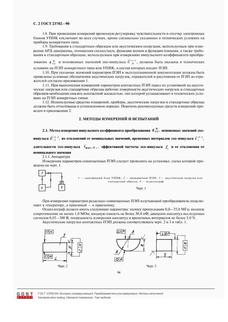 「pymna n19M E K r O C y I A P C T B E HH bICTAHIAPTKoirpob Hepa3pyuaounPEOBPA3OBATEJIH YJIbTPA3BYKOBbIETOCTMeTOa HcmbrramHi23702-90Nondestructive testing.Ultrasonic transducers.Test methodsMKC191000K1427619ara sBeaeHna 01.01.92HacTosi cTaHnapT pacnpocTpaHserca Ha y.bTpanyKonbe me3oneKrpueckne npeo6paonaTem noTOCT 26266 (nanee -n13n).HMeoue paboyyo o6nacn yacToT B aHana3oHe oT 0.16 no 30,0 Mru HnpenHa3HaeHHble Ta paooThl B cocTaBe ynbTpa3nyKoBblx npHoopoB Hepa3pyialoiero KoHTpona (nanee-yIHK)npH 9xo-M TeHeBbX MeToaax KoHTpo.s.CTaHaapT ycTaHanHnaeT o693aTeIbHble Tpe6onaHna K MeTonaM HaMepeHna OCHOBHbIX napameTpon(nanee-napaseTpu)u HcnbrTaHni I13n no nn.2.3,2.8,2.18,npH nposeneHHH HcnbrTaHi noBepKn.nepeueHb ocHOBHLIX napaMeTpoB n3n npmneneH B TOCT 26266.1.OBIINE TPEBOBAHMS1.I.HopMaTbHble KHMaTHeckHe ycnoBHa H3MepeHHa nOTKHLI 6LTE cneayiowHe:-TeMneparypa okpyaloiero Boanyxa (20 5)'C:TeMnepaTypa BOAbI B HMMepCHOHHoA BaHHe (20+5)C:.aTMOCΦepHoe aameHne(96±10)Kna:-OTHOCHTEbHas BTaXHOCTb BO3Tyxa (6015).1.2.Hanpsxerte H acTora nepeMeintoro ToKa mirTaHna iMepirrenbHon amaparypi aoDKH coomeT-CTBORaTE TpeooBaHHAM cTaHnapToB H TexHHecKix ycnoBHA Ha npHoopbl KOHKpeTHoro Tna.BHopauHH,BHeuIHHe eKTpHqeckne H MarHMTHble nong nOnxHbI HaXOITCa B npenenax,ycTaHoB.neHHbIX B cTaHaapTax H TexHHyecKnx ycoBHax Ha ynHK H H3MepiTenbHylo annaparypy.1.3.BpeMs nporpena npnGopoB,ncnom3yeMbIx npn nponeneHn MMepemnA,ycraHanmBaoT B COOT-BeTCTBHH c 3KcnyaralHoHHon nokyMeHTauHeR Ha 3TH npHGopbl.1.4.npi HMepeHn napaMeTpoB HMMepCHoHHbx n311 He onyckaeTca Hamune ny3LpbKoB BoyxaHa HX noBepxHOCTH H Ha noBepxHOCTH oTpakaTeJa.1.5.Ecu conMecTas pabora n3nl c yIHK npenycMaTpunaeT Hcnonbaonanme coraacyionx yeT-poncTB (TpaHcdopstaropoB,KoppeKTupyloux uenei I T.n.),Hx cxeMba ycoBna noaknoyeHa K n3nnpH nponeneHHH H3MepeHHi AODKHbI 6LITb yKaaHbl B TexHHecKnx yCOBHAX Ha 1131I KOHKpeTHLIX THnOB.1.6.IIpit H3MepeHnu napameTpoB nepenaToyHoR (yHKiHH HMnyLCHoR xapakrepHCTHKH H 9.ekTpH-veckoro conpoTHmneHna noakmoualoT n13n1 K M3MepuTenbHon ycraHonke ka6eneM,ecan ero THaHe MeHee 500 MM.B npoTHBHOM cTyuae coeaHHHTebHbIM KaoeneM,HMeloLHM napaMeTpbl:eMKOCTb(60±3)n④;BOTHoBOe conpoTHBneHHe(S土3)OM;Ko3中中HUHeHT3 aTyxaHHa Ha yacTore I0MTu一ie6oee 0,I n5/M.1.7.MaMepeHna napameTpon 11311,BLnOHaeMhe coBMecTHo c yIHK,cnemyeT npoBOTb c oneKT-poHHLIM GJOKOM ynHK,aTrecToBaHHbIM B ycTaHonneHHOM nopake.n13n noakmoaOT K eKTpoHHoMyGnoky yIIHK cornacHo 3KcnnyaTainoHHon okyMeirraun Ha ynHK.HomyckaeTea BMecTo nekrpoHHoroSnoka ynIHK HcnonboBaTb TonbKo ero 6nok reHepaTopa HMnynbcoB Bo3GyneHna H (H)6aok npHeM-HHKa.月3U1 ame o中Ha0e★G▣5TTOCT 23702-90,KoHTponb Hepa3pywawn.npeo6pa3oBaTenn ynbTpa3ByxoBbe.MeTon b ncnbITaHnMNondestructive tesfing.Ulrasonic transducers.Test methods