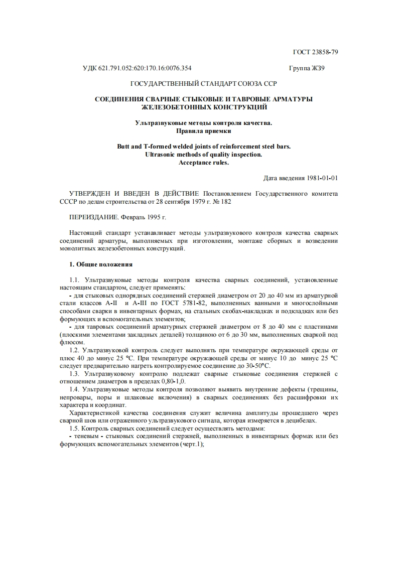 T0CT23858.79yK621.791.052:620:170.16:0076.354Tpynna X39TOCYJAPCTBEHHDIM CTAHJIAPT COIO3A CCPCOEIHHEHHA CBAPHbIE CTbIKOBbIE HTABPOBbIE APMATYPbIKEIE3OBETOHHbIX KOHCTPYKIINHyILTPa3BYKOBbIe MeTOIbI KOHTpOJI KaeCTBa.TIpaBHna npneMKnButt and T-formed welded joints of reinforcement steel bars.Ultrasonic methods of quality inspection.Acceptance rules.Mara BBeneHHs 1981-01-01yTBEPXKIEH H BBEJIEH B IEHCTBHE IlocTaHoBneHHeM TocyaapcTBeHHoro KOMHreraCCCP no enaM cTpourenbCTBa OT 28 ceHTa6ps 1979 r.Ne 182ΠEPE3LAHE.ΦeBpa1b1995r.HacTosui craHnapT ycTaHaBBaeT MeTOAbI ynbTpa3ByKoBoro KOHTpo kavecTBa cBapHbIXcoeAHHeHHn apmatypbl,BbINOTHeMbIX npH H3rOTOBCHHH,MOHTake coopHbIX H BO3BeneHHHMOHOJHTHLIX eJe300eTOHHbIX KOHCTPYKIHH.1.O6IHeⅡ010 ke1.1.ynTpa3ByKOBble MeTOI KOHTpOn kavecTBa cBapHbIX coeAHeHni,ycTaHoBnCHHbleHacTosIHM cTaHnapToM,cneyer npHMeHsTb:CTLIKOBLIX ONHOPSJHLIX coeHHeHHi cTepKHei amameTpoM OT 20 0 40 MM H3 apmatypHonCTaIH KaCcoB A-II H A-III no TOCT 5781-82,BbInOJHeHHLIX BaHHbIMH H MHorOCnoiiHbIMMcnoco6aMH CBapKH B HHBeHTapHbIX opmax,Ha CTaIbHbIX CKOGax-HakJankax H noAKaakax WIH 6e3opMyIOLIHX H BCNOMOraTeJIb HbIX 3eMeHTOB;Is TaBpOBbIX coeHHeHHi apmaTypHbIx cTepxKHei ameTpoM OT 8 O 40 MM c IaCTHHaMH(IIOCKHMM 3neMeHTaMH 3aKJaHbIX eTanei)TOJLIMHOIO OT 6 0 30 MM,BbINOJIHEHHbIX CBapkoi no中IOCOM.1.2.yTpa3ByKoBoi KoHrpo cnetyeT BbInOJHaT npn Temneparype oKpyaromei cpeabl Ornoc 40 no MHHyc 25 C.IIpn TeMneparype okpyaouei cpel Or MHHyc 10 no MMHyc 25 Ccneayer npeaBapureJbHo Harperb KOHTpopyemoe coe HeHHe no 30-50C.1.3.ynbTpa3ByKOBOMy KOHTpoTo nowexaT cBapHble CTLIKOBbIe coeHeHHa cTepKHei cOTHoLeHHeM AmameTpoB B npenenax 0,80-1,0.1.4.ybTpa3ByKOBbIe MeTOAbI KOHTPOJ nO3BOISIOT BLISBHTE BHyTpeHHne aedeKrbl (TpeLHHLI,HenpoBapbl,nopbl H maKoBble BKJOyeHH)B CBapHbIX coeAHHeHHaX oe3 pacuopoBKH Hxxapakrepa H Koop HHar.XapaktepHcrnkon KavecTBa coeHeHHs cyHT BeJHHHa amnnrybl npomenero vepe3CBapHoi LIOB HIH OTpaxkeHHoro yJ Tpa3ByKOBoro CHrHaia,KOTopa H3Mepserca B neuHoenax.1.5.KoHTpob cBapHbIx coeAmHeHni cneryeT ocyuecrBJST MeTOaMH:TeHeBbIM CTbIKOBbIX cOCAHHeHHH cTepHen,BbINOJHeHHbIX B HHBeHTapHbIX oopMax HJH oe3opMylOLHx BcnoMoraTeJbHbIX 3neMeHTOB (uepT.1);
