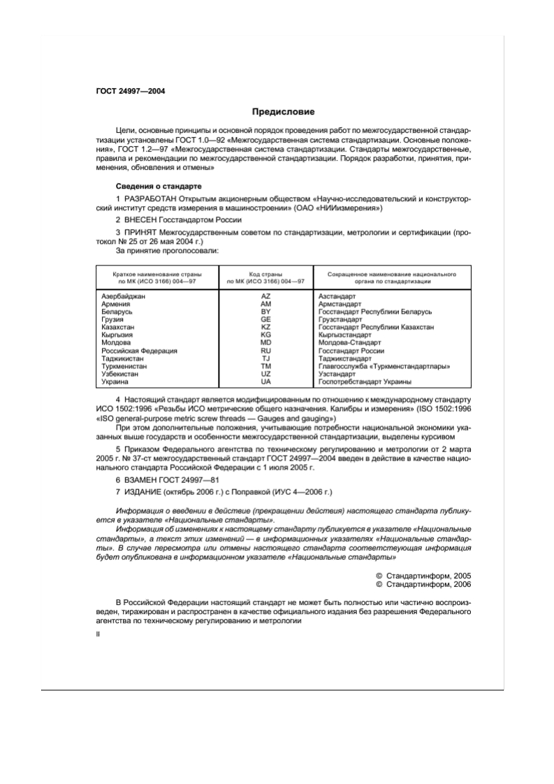 TOCT 24997-2004 Ka.IHopbI Is MeTpHreckoii pe3b6bl.onycKHMEXKTOCyDAPCTBEHHbIN COBET nO CTAHDAPTN3ALNN,METPOnOnMN N CEPTNONKALNM(MrC)INTERSTATE COUNCIL FOR STANDARDIZATION,METROLOGY AND CERTIFICATIONsC】「OCTMEK「OCyAAPCTBEHHbIN24997-CTAHAAPT2004(MC01502:1996)KANN6PbI A METPNYECKON PE3b6blonyckn1S01502:1996ISO general-purpose metric screw threads-Gauges and gauging(MOD】M3AaHM0O中uHanbHo0國安