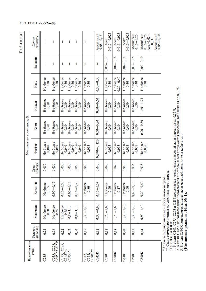 Tpynna B20M E K T O C y IA P C T B E HH BIHIPOKAT IIA CTPONTEIbHbIXCTAJIbHbIX KOHCTPYKIINNOomHe TexHHecKHe ycnoBHaTOCT27772-88Rolled products for structural steel constructions.General specificationsMKC77.140.500KΠ092500.093000.097000.112000Hara BBeaeHHa 01.01.89HacToaui cTaHapr pacnpocTpaHserca Ha ropauekaraHbli acoHHbl (yroJKn,AByTaBpbl,IBeJ-JepbI),JIHCTOBOH,IIINpOKonOJoCHbIN yHHBepcabHbIH npokaT H THyTbIe npoHIH H3 yrepoCToH HHH3KOJerpoBaHHOH CTaJIH,npeHa3HaeHHble CTpONTeJbHbIX CTaIbHbIX KOHCTpyKIIMH CO CBapHbIMHH pyrHMH coeHHeHHAMH.onyckaeTca npHMeHaTb npokaT,H3roToBJIeHHbIH no HacToameMy cTaHnapTy,a pyrnx oTpacnennpoMbIlILIeHHOCTH.1.COPTAMEHT1.1.DacoHHbli npokar n3roToBnOT 3 cTann C235,C245,C255,C275,C285,C345,C345K,C375,JHcToBoi yHHBepcanbHbli npokar n rHyTble npon -H3 cTa C235,C245,C255,C275,C285.C345.C345K.C375.C390.C390K,C440.C590.C590KII p H M e y a HH e.BykBa C o3Hayaer-cTanb cTpoHTeJbHas,unopbI yCJoBHo 0603HayaloT npenen TekyyecTHnpokara,oykBa K BapmaHT XMMMyeckoro cocTaBa.CooTBeTCTByonme Mapkn no neicTByIOIM CTaHnaptaM npHBeneHbI B npHJoeHHH 1.1.2.Io opMe,pa3mepaM H npenebHbIM OTKJIOHeHHSIM npokaT noJkeH cooTBeTCTBOBaTb TpeooBa-HHAM:TOCT 8509-Is yroBoro paBHonOnoHoro,TOCT 8510-Ia yrJoBoro HepaBHOnQJoHoro,TOCT 8239-Ia 6aJIok ByTaBpoBbIX,TOCT 19425-Ia 6aJok ByTaBpoBbIx H IBeJJepoB cneuaIbHbIX,TOCT 26020-J ByTaBpoB c napaeJbHbIMH rpaHMH nOJOK,TOCT 8240-I BeJLIepoB,TOCT 19903-Ia JIHcTOBoro npokaTa,TOCT 82-Ia IHpokonoJocHoro yHHBepcaJbHoro npokata,HTII-IS JIHCTOB npoceHo-BbITSDKHbIX,TOCT 8568 -Is JHCTOB c poMoHueCKHM H yeueBHHbIM pHoJeHHeM,T0CT7511.T0CT8278.T0CT8281.T0CT8282.TOCT8283.T0CT9234.TOCT10551.T0CT13229,TOCT 14635,TOCT 19771,TOCT 19772,TOCT 25577-Ja npoowei rHyTbIx.1.3.YCJIoBHble 0603HayeHna npokata OKHbI COoTBeTCTBOBaTb npHBeleHHbIM B npHloxeHHH 2.2.TEXHNYECKHE TPEBOBAHN2.1.IIpokar H3rOTOBJISOT B COoTBeTCTBHH C Tpe6oBaHHAMH HacTosero cTaHapra no TexHOIOrH-ecKoMy perameHTy,yTBepxeHHoMy B ycTaHoBJeHHOM nopanke.2.2.XHMHecKHi cocTaB CTaIH no IaBOYHoMy aHaIH3y KoBIOBo npoobI oJKeH COOTBeTCTBOBaTbHopMaM,npHBeneHHbIM B TaOI.I.