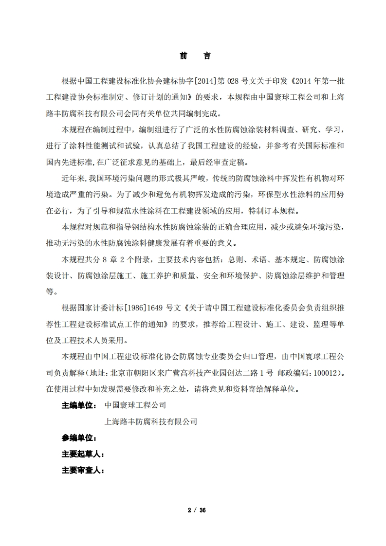 钢结构水性防腐蚀涂料应用技术规程Technicalspecificationforapplicationofsteelstructurewater-basedanticorrosivepaint(征求意见稿)主编单位_中国寰球工程公司上海路丰防腐科技有限公司批准单位_中国工程建设标准化协会A实施日期_2017年月348072@abc5天前发布关注私信0.85MB36页022钢结构水性防腐蚀涂料应用技术规程Technicalspecificationforapplicationofsteelstructurewater-basedanticorrosivepaint(征求意见稿)主编单位_中国寰球工程公司上海路丰防腐科技有限公司批准单位_中国工程建设标准化协会A实施日期_2017年月此内容为付费资源,请付费后查看¥19¥23黄金会员免费钻石会员免费立即购买您当前未登录!建议登陆后购买,可保存购买订单付费资源 第1页 / 共36页 第2页 / 共36页 第3页 / 共36页 试读已结束,还剩33页,您可下载完整版后进行离线阅读 THE END标准规范餐饮美食 喜欢就支持一下吧收藏