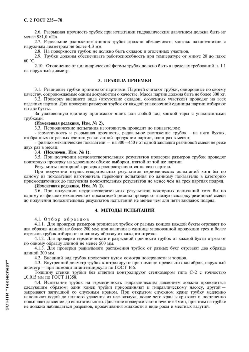 yK621.643.33:621.65:006.354「pma163M E K T O C y IA P CT B E HH bICTAHIA PTTPYBKN PE3HHOBbIEII BEJIOCHIIEIHbIX HACOCOBTexHngeckHe ycnoBHaTOCT235-78Rubber tubes for bicycle pumps.Specifications0KΠ2549996700aTa BBeaeHHs 01.01.79HacToamnit cTaHapT pacnpocTpaHseTca Ha pe3HHOBble Tpy6Kn c Hapy KHon nekopaTHBHoM HITAHooILIeTKon,mpenHa3HayeHHble IIa HarHeTaHna Bo3yxa B KaMepbl BeJlocnneHbIX IMH C noMoLblo pyyHbIXHacocoB.1.OCHOBHbIE PA3MEPbI1.1.Pe3MHOBble Tpy6KM OJDKHbI BbIrycKaTbCs IIHHoM He MeHee 600 MM,BHyTpeHHIM IMaMeTpoM(3,0+0,4)MM,HapyHbIM IMaMeTpOM Tpy6Kn c oILIeTKo (7,0+0,5)MM.(M3MeHeHHaa perakia,M3M.Ne 1).1.2.TouHa cTeHKM Tpy6oK 6e3 orteTKn HOJDKHa 6bITb He MeHee 1,25 MM.2.TEXHNYECKHE TPEBOBAHHA2.1.Pe3MHOBble Tpy6KH ODKHbI H3rOTOBJISTLCA B COOTBeTCTBIN c Tpe6OBaHHAMM HacTosIerocTaHnapra H COOTBeTCTBOBaTb KOHTPOJIbHbIM 06pa3utaM Ha lponyKIo H TexHHyeckon HoKyMeHTaLM,yTBepxneHHbIM B ycTaHoRIeHHOM Hopske.2.2.Tpy6KH O/DKHbI HMeTb HapyKHylo ekopaTHBHyo oILIeTKy H3 LBeTHbIX HHTOK SpKnx pacuBeToK.Ita OILteTeHna npMMeHaIOTCa xIoIyaTo6yMaxHble HHTKI Ne 30 wI 40 nO TOCT 6309,aueTaTHaa HITb16,6 Tekc WIn HITKI Ne 15 H3 HaTypaIbHoro Ietka no TOCT 22665.2.3.Io H3HKo-MexaHnyecKHM noKa3aTeJaM pe3HHa,npnMeHseMas Is H3rOToBIeHMS Tpy6oK,HOJDKHa COOTBeTCTBOBaTb HopMaM,yKa3aHHbIM B TaoJIue.HalMeHoBaHhe nokacarenaHopsaMeToa HcIbTaHHsycoBHaa npoHOCTb npH pacT米CHMH,MΠano TOCT 270,o6pa3en THna 1.TomHon(Krc/cM2).He MeHee6.37(65)(2±0,2)MMOTHOCHTetbHoe yuIHeHHe npH pa3pbiBe,To xeHe MeHee170TeMneparypHbi npentet xpynkocT,'C,HeTo TOCT 7912,o6paseu THna ABbIeMHHyc 252.2,2.3.(M3MeHeHHaa penakua,M3M.Ne 1,2).2.4.Pe3MHOBaa cMecb,npenHa3HayeHHaa Ia H3roTORIeHNA M3eJmi,paboralnx B 30He Tpon-yeckoro KJIMMaTa,HO/DKHa cooTBeTCTBOBaTb Tpe6oBaHHAM TOCT 15152.ILIA panoHoB c TponnyecKnM KJmMaToM oIIeTeHHe Tpy6oK npOn3BOIMTCA HHTKaMH H3 HaTypaIbHoromeJrka.2.5.Tpy6Kn ODKHbI 6bITb repMeTHYHbIMH nIpH HCIbITaHMH rMpaBmyecKnM aBleHneM He bojtee392.4k1a.(H3MeHeHHaa penakuna,M3M.Ne 2).M3 aHHe o中HaJbHoeTepenearka BocnpemeHaM3nareJbCTBo cTaHapToB,1978MIIK M3uarecTBo cTaHaapToB,2001