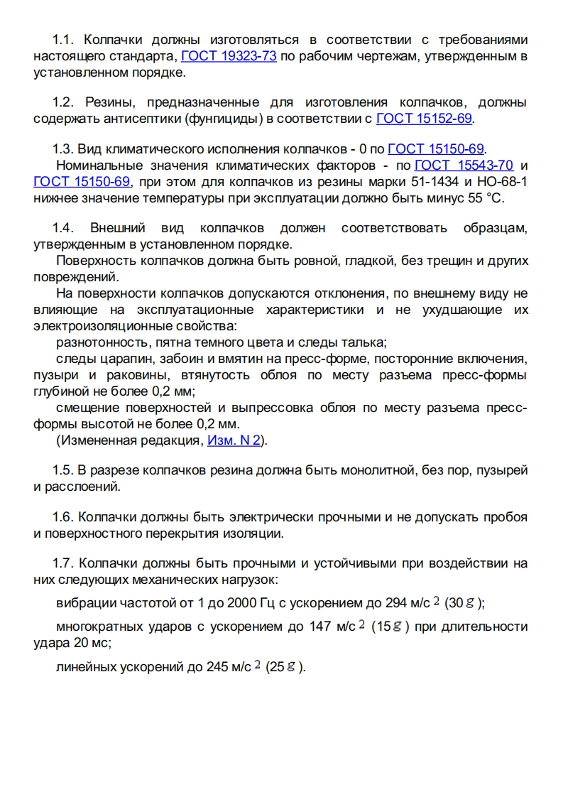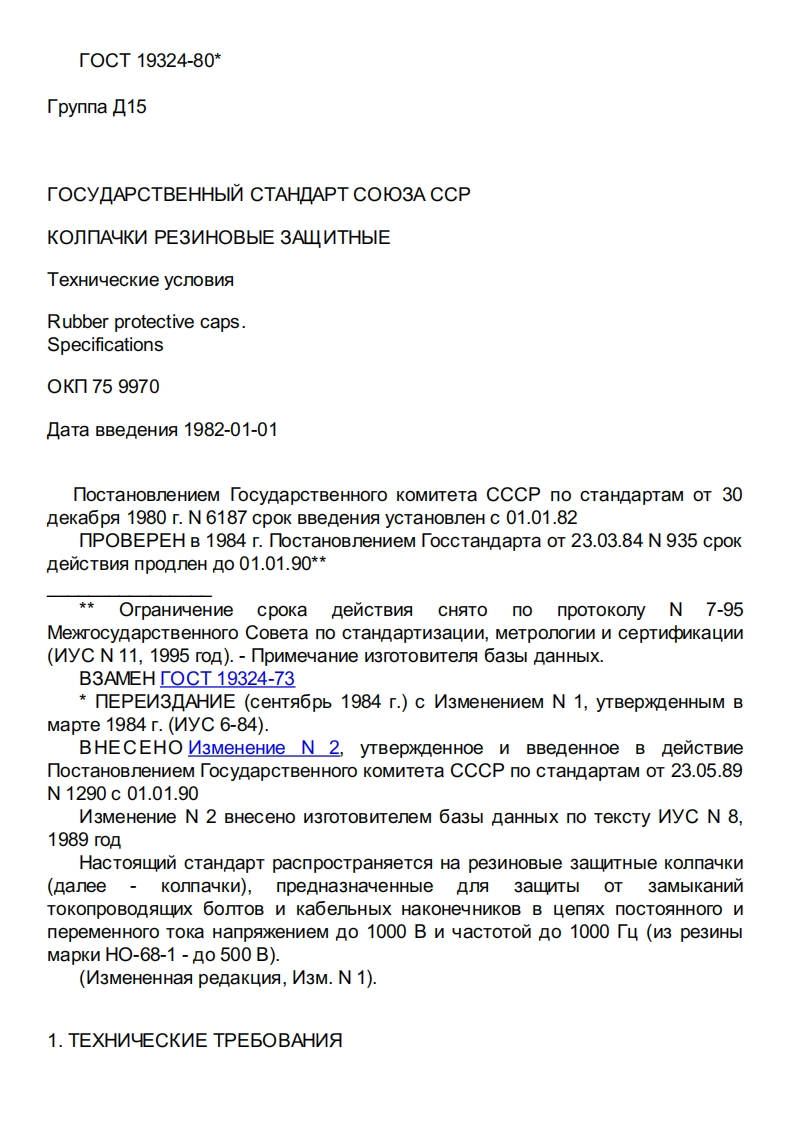 「0CT19324-80*「pynna15TOCYAPCTBEHHbIM CTAHAAPT COIO3A CCPKonnAYKN PE3VHOBbIE 3AWVTHbIETexHnyeckne ycnoBnaRubber protective caps.SpecificationsOKn759970aTa BBeneHna 1982-01-01nocTaHoBneHneM TocynapcTBeHHoro KOMNTeTa CCCP no CTaHnapTaM OT 30Aeka6pa 1980 r.N 6187 cpok BBeneHna ycTaHoBneH c 01.01.82nPOBEPEH B 1984 r.nocTaHoBneHneM ToccTaHAapTa OT 23.03.84 N 935 cpoKAencTBna nponneH no 01.01.90**OrpaHnueHne cpoka encTBN CHATO no npoTokony N 7-95MexrocynapcTBeHHoro CoBeta no cTaHnaptn3aunn,Metponorwn n cepTnobnkaunn(MyC N 11,1995 ron).npnMeyaHne n3roToBnTena 6a3bl naHHbIx.B3AMEHTOCT 19324-73nEPEV3AHVE (ceHT96pb 1984 r.)c V3MeHeHneM N 1,yTBepxneHHbIM BMapre1984r.(yC6-84).BHECEHO M3MeHeHne N 2,yTBepxneHHoe n BBeneHHoe B AencTBnenocTaHoBneHneM TocynapcTBeHHoro KOMNTeTa CCCP no cTaHAapTaM OT 23.05.89N1290c01.01.90V3MeHeHne N 2 BHeceHo N3rOTOBNTeneM 6a3bl AaHHblx no TekcTy MyC N 8,1989 roHacTogwNn cTaHnapT pacnpoctpaHaeTCA Ha pe3NHoBble 3aLTHble konnauKn(Aanee KonnayKn),npeHa3HayeHHble 3awTbl OT 3aMblKaHNNTOKonpOBOAWX 6ONTOB N KabenbHbIX HaKoHeyHNKOB B LenAx noCTOAHHorO WnepeMeHHoro ToKa HanpsxkeHneM Ao 1000 B n yacToTon Ao 1000 T4(n3 pe3MHblMapKn HO-68-1-Ao 500 B).(V3MeHeHHag penakun9,V3M.N 1).1.TEXHVYECKVE TPE6OBAHVA