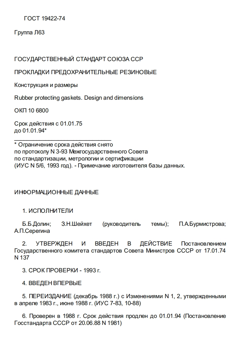 「0CT19422-74「oynna63TOCyAPCTBEHHbIM CTAHDAPT COKO3A CCPnPOKAKW nPEOXPAHNTENbHbIE PE3MHOBbIEKoHCTpyKuNa n pa3MepblRubber protecting gas kets.Design and dimensions0Kn106800Cpok neNcTBna c 01.01.75A001.01.94*OrpaHnueHve cpoka AencTBna CHATOno npoTokony N 3-93 MexkrocynapcTBeHHoro CoBeTano cTaHnapTn3auwn,Metponornn n cepTnobnkauwn(MyC N 5/6,1993 ron).-npnMeyaHne n3roToBnTena 6a3bl AaHHbIX.VHOPMALVOHHbIE AHHbIE1.VcnonHNTEnN6.6.nonMH;3.H.山exeT(pyKoBonNTenbΠ.A6 ypMncTpoBa;A.Π.CeperHa2.yTBEPXKDEH W BBEAEH B ENCTBVE nocTaHOBneHneMTocynapcTBeHHorO KOMNTeTa cTaHnapToB CoBeTa MNHNCTpoB CCCP OT 17.01.74N1373.CPOK nPOBEPKV -1993 r.4.BBEEH BNEPBbIE5.NEPEM3AHVE (neka6pb 1988 r.)c V3MeHeHNAMn N 1,2,yTBepxneHHbIMnB anpene 1983 r.,WIOHe 1988 r.(VyC 7-83,10-88)6.npoBepeH B 1988 r.Cpok nencTBna nponneH Ao 01.01.94 (nocTaHoBneHneToccTaHnapTa CCCP oT 20.06.88 N 1981)