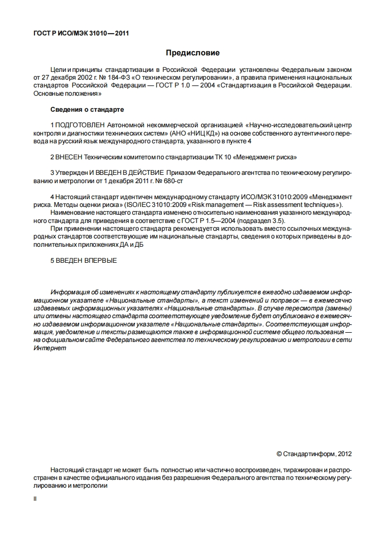 ΦEAEPAbHOE ArEHTCTBOnO TEXHNYECKOMy PErynNPOBAHNIO N METPOnOrNNHAUMOHAnbHbIN「OCT P VCO/M3KCTAHAAPTPOCCNNCKON31010一ΦEAEPA4MM2011MeHeMeHT pnckaMETObI OUEHKN PNCKA1S0MEC31010:2009Risk management-Risk assessment techniques(IDT)M3 naHne o中nunanbHoe©到MocKBaCTaHAapTMH中opM2012