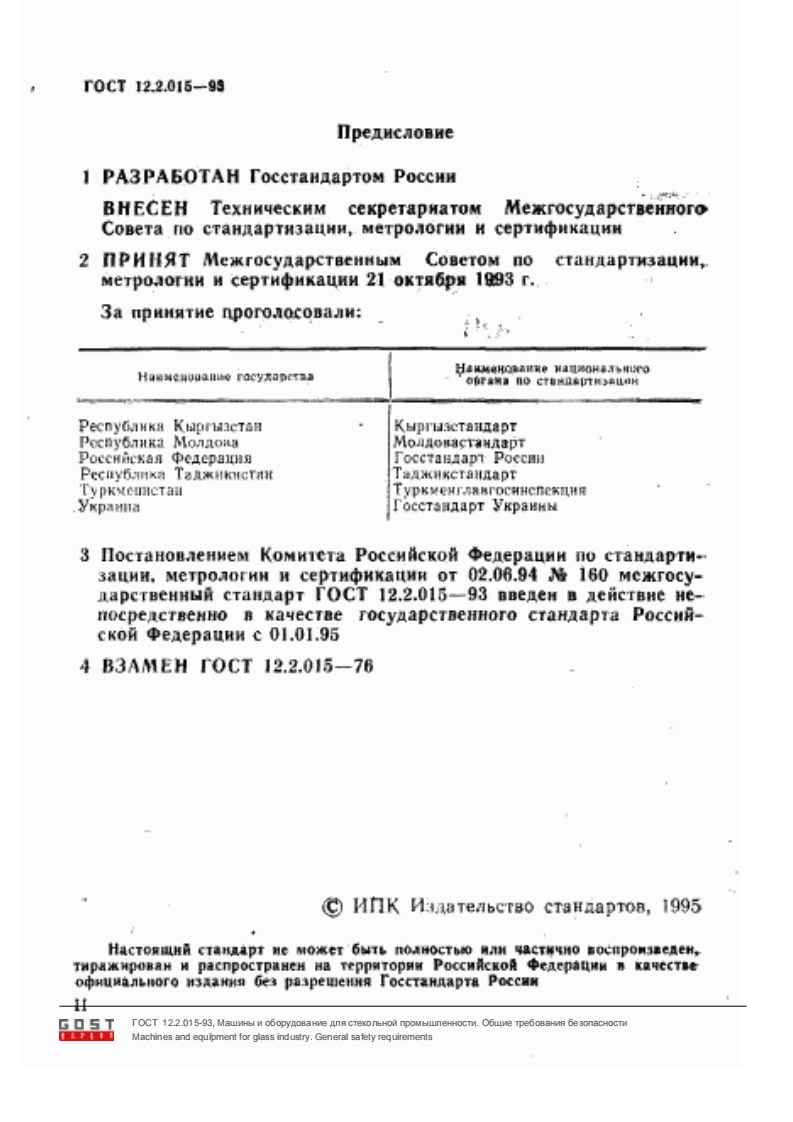 0CT12.2.015-93M E XK r O C y I A P C T B E HHH R C T A H I A P TMALLNHbI N OBOPyOBAHNE ACTEKOJIbHOA nPOMbILIJIEHHOCTHOBLIHE TPEBOBAHHA 6E30nACHOCTHH3 naHme o中AIHaAbHOewt名空江9MEXKTOCyAPCTBEHHbIA COBETNO CTAHAPTH3ALHH,METPONOTHH H CEPTHOHKAUHHMHHCKGOSTTOCT 12.2.015-93,MawMHbl M o6opyAoBaHne Ana CTexonbHoi npoMblneHHOCTM.O6une Tpe6oBaHMR 6e 3onaCHOCTMMachines and equipment for glass industry.General safety requirements