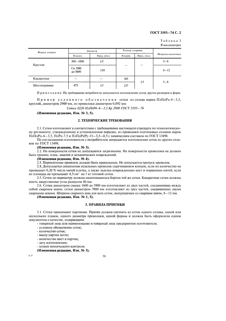 Tpynna B76M E r O C y IA P C T B E HH bI HCTA HIA PTCETKN KATAIN3ATOPHbIE H3 IIJIATHHOBbIX CILIABOBTexHnyeckHe ycnoBHaTOCTPlatinum alloy catalytic gauzes.3193-74SpecificationsMKC77.140.60KΠ199564Hara BBenenna 01.01.75Hactosi cramnapr pacnpocTpanaerca Ha TKaHble rnankHe ceTKH c KBanpaTHbIMM ayenkaMH N3naaTHHOBbIX cnTaBoB,npHMeHgeMble B KayecTBe KaTanH3aTopoB npM OKMcneHHH aMMHaka.(M3Menenag penaKuma,H3M.Ne 4).1.COPTAMEHT1.1.Pa3Mep cTopoHbl ayeAKH B cBeTy,pa3Mepbl H KoHyecTBo ocooo KpymHbix sueek,a Takke InaMeTpnpoBOJOKH IIA ceTOK AOKHLI COOTBeTCTBOBaTL yKa3aHHbIM B Ta6.1.1.Ta61Mμa1PasMep croponb syelikn s cnery具aMerpnponon0k鞋.MH(cnpaBD'HaejOco6o xpynnblenpe.Tk,HVe教kH。笔na I cxa1里gExM3 MepeH HNIXC OTKOHEHHIHownn.Ha l cul且0 nvexalrc双OTK.ANKHI只eeK「0TK101指eM只o1延1D时HDuHcpeanero ap中eriwHbHorO s统已1塘K1EHe bo.teepe门enax0,220±10+600斤+5090.092±0.00432102440+73n p H M e yaH H1.MHHyCOBbe OTKJOHCHHS UIR OTHCTbHoi seKH,a Takxe KoHyecTBo sceK C OTKJOHCHHHMM OT HOMM-HALTbHorO pa3Mepa Ao +50 He HopMMpyOT,HO JHMMTHpyIOT npene.TbHBMH OTKJOHCHHAMM IIR ex H3MepCHHbIxaeex (OTKnOHeHHeM OT cpeaHero apncMernyeckoro 3HayCHIa)B npeaenax 10.COOTBETCTBHM C Tpe6OBAHMAMH 3aka34Hka.3.Teoperireckan Macca 1 AM2 cerKi ykasaHa B npinoxeHin.(H3Menemnaa penaKua,M3M.Ne 3).1.2.CeTKH O.DKHbI 6bITb packpoeHbI.CeTKH H3TOTORIISIOT KpyTJLIMH (Kp),KBanpaTHLIMH (KB)HⅢeCTHrPaHHbIMH(L山r).ΦDpMLI H pa3 Mepbl ceToK AO米HLI COOTBeTCTBOBaTL Yka3 aHHbIM B Ta6n.2.M3 nane o中Ha.abH0e90