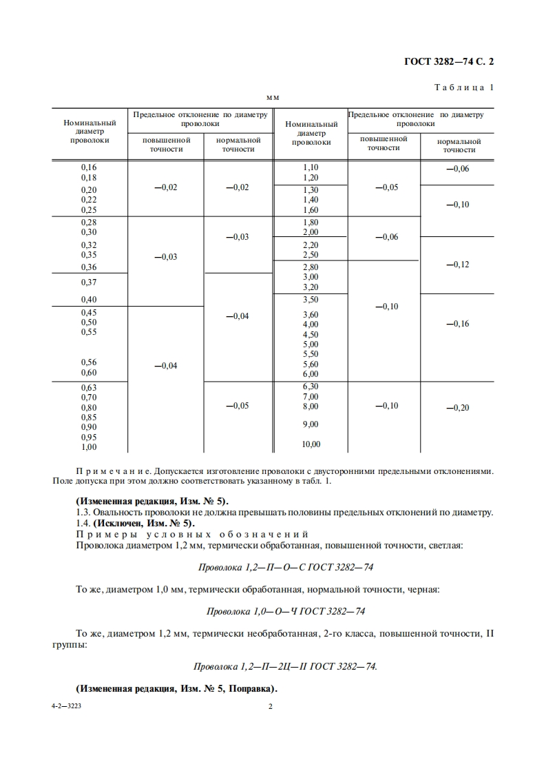Tpynna B71M E K T O C yA P C T B E HH bICTAHIAPTIPOBOJIOKA CTAIbHAA HN3KOYTJIEPOINCTAAOBIIIETO HA3HAYEHIATOCTTexHHeckHe y℃IOBHA3282-74General-purpose low-carbon steel wire.Specifications0KΠ121100Mara BBeaema01.01.75HacTosumi cTaHnapT pacnpocrpaHserca Ha kpyryo HH3KoyrJepoancryo cTabHyio npoBonoky,npea-Ha3HayeHHyo I H3rOTOBEHna rBo3Ien,yB93KH,orpaxeHni H pyrx uenen.(M3MeHeHHaa penaKia,M3M.Ne 5).1.THIIbI H OCHOBHbIE PA3MEPbI1.1.IIpoBonoka H3rOTOBJISeTcs:ΠBHIy O6 paooTk:TepMnecKH oopaooTaHHas-O;TepMHecKH HeoopaooTaHHas;O BHIyΠIOBepxHOCTH:6e3ΠoKpbITHS,CΠoKpbITHeM.IIpoBonoka 6e3 nokpbITHa TepMnyecKH oopaooTaHHaa H3roToBeTca cBeTnoi (C).a no cornacoBaHmonoTpeonteJa c H3rOTOBHTeeM onyckaeTca H3roToBeHHe yepHoi (npoBoJoKH.IIpoBoJoka c nokpbITHeM nopa3enseTca Ha:OUMHKOBaHHyIo 1-ro KJacca-1LI,OLMHKOBaHHyo 2-ro KJacca -2LI:nO TOHOCTH H3TOTOBJIeHHA:noBbIeHHO一Π,HOPMAIbHOno BpeMeHHOMy conpoTHBJIeHHIO pa3pbIBy (TOJIbKO IA TepMHeCKH HeoopaooTaHHoH npOBOJOKH):I rpynmbI -I,Ⅱpyb一I.(M3MeHeHHaa penaKIma,M3M.Ne 5).1.2.TIpoBoJoka H3roToRseTca HaMeTpoM:oT0,16Io10,00MM一6e3ΠoKpbITHA:OT 0,20 0 6,00 MM -c nokpbITHeM.IHaMeTp npoBOJOKH H npeneJbHble OTKJIOHeHH nO HeMy IOJXHbI COOTBeTCTBOBaTb yka3aHHbIM BTa6n.1.