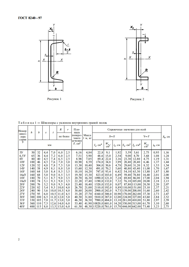 T0CT8240-97M E XK T O C Y IA P C T B E HH bI H C T A H IA P TIBEJIIEPbI CTAIbHbIE TOPAYEKATAHbIECopTaMeHTHot-rolled steel channels.Assortmentara BBeneHHa 2002-01-011 O6acTb npHMeHeHnaHacrosmi cTaHnapT ycraHaBJHBaeT copTaMeHT craJbHbIX ropsyekaraHbIx mBeJepoB oomero HcneLMaJIbHoro Ha3HayeHH BbicoToi OT 50 o 400 MM H IMPHHoi noJoK OT 32 O 115 M.2 OcHOBHbIe napameTpbI H pa3MepbI2.1 no oopMe H pa3MepaM uBeJepbI H3rOTOBISOT cnenyiounx cepnit:y -c yKJOHOM BHyTpeHHHx rpaHei noJoK;Π-cΠapaebHbIMH rpaHaMH nOJIOK;O一3 KOHOMHYHbIe CⅡapaeJbHbIMn rpaHsMH nOJIOK;I一nerkoi cepnn cΠapaeJbHbIMM rpaHSMM nOJOK:C一cneuabHble.ycnoBHble 0603HaueHHa BeMH,xapakTepn3yIoumx cBoHcTBa IBeiepa:h-BbIcOTa (IBeJLepa);b一HpHHaΠOTK;TOJIIMHa cTeHKH;一TOJINHaΠOIKE;R-panyc BHyTpeHHero 3akpyrneHna;Xo-paccToHne OT OCH Y-Y nO HapyKHoH rpaHn cTeHKH;△一ΠepekocΠoKE,f-npom6 cTeHKH no BbIcoTe ceveHns npooWIs;F-nomanb nonepeHoro ceveHns;I一MOMeHT HHepIMM,.W一MOMeHT conpOTHBJIeHH;pannyc HHepun;Sx一cTaTHecKn MOMeHTΠoJycete HH.2.2 IIonepeuHoe ceueHne IBeJepoB cepni y,C OJKHo COoTBeTCTBOBaTb npHBeneHHoMy HapHcyHke1,cepniΠ,O,I一Ha pncyHke2.2.3 Pa3Mepbl BeJepoB,nomab nonepeHoro ceqeHns,Macca 1 M n cnpaBo Hble 3HayeHn Isocei OJKHbI COoTBeTCTBOBaTb npHBeneHHbIM B Ta6JHuax 1-5.2.3.1 IIomtanb nonepeHoro ceyeHna H Macca 1 M IBeJepa BbrHcneHbI no HOMMHaIbHbIM pa3-MepaM,IIOTHOCTb CTaH npHHaTa paBHoi 7,85 r/CM3.