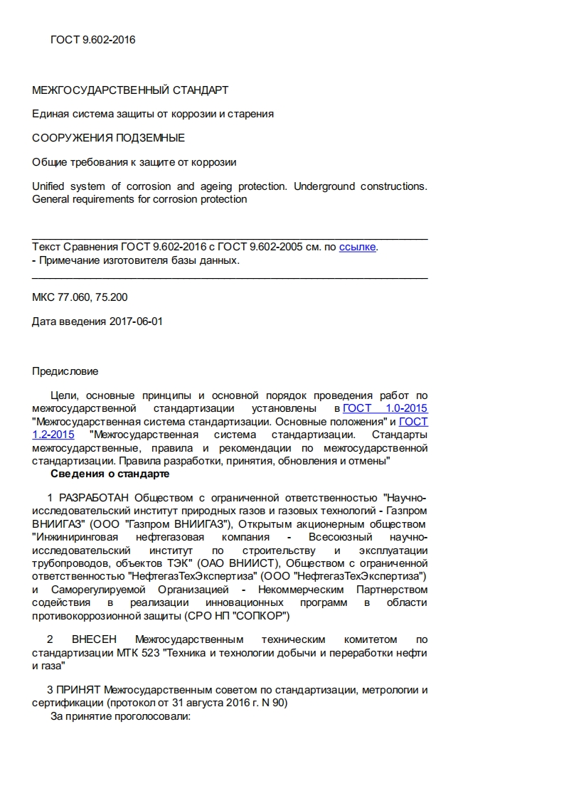 「0CT9.602-2016MEXKrOCYAPCTBEHHbIN CTAHDAPTEnMHaq CncTeMa 3awMTbl OT Koppo3nn n CTapeHnACOOPYKEHNA NO3EMHbIEO6wne Tpe6oBaHna K 3aunre OT Koppo3wnUnified system of corrosion and ageing protection.Underground constructions.General requirements for corrosion protectionTeKcT CpaBHeHMA rOCT 9.602-2016 c rOCT 9.602-2005 CM.no ccbinke.npMMeyaHne N3rOTOBNTenA 6a3bl naHHblX.MKC77.060,75.200naTa BBeneHMa 2017-06-01冂penncnoBneLenw,OCHOBHble npnHuNnbl n OCHOBHON nopanok npoBeneHna pa6oT noMexrocynapcTBeHHoN CTaHnapTn3auwn ycTaHoBneHbl B OCT 1.0-2015"MexrocynapcTBeHHa CnCTeMa CTaHnapTn3auwn.OCHOBHble nonoxeHna"OCT1.2-2015 "MexrocynapcTBeHHa cucTeMa CTaHAapTn3auwn.CTaHAapTblMexkrocynapcTBeHHble,npaBnna n peKoMeHnaunn no MexkrocynapcTBeHHoNCTaHAapTn3aywn.npaBnna pa3pa6oTKn,npnHATn9,06HOBneHna N OTMeHbl"CBe neHna o cTaHnapTe1 PA3PASOTAH O6wecTBOM c orpaHnyeHHON OTBeTCTBeHHOCTbIO "HayuHo-nccnenoBatenbcKnn NHCTMTyT npnpo HbIx ra30B n ra30BbIX TeXHonomn-Ta3npoMBHMVTA3"(OOO "Ta3npoM BHVVTA3"),OTKpbITbIM akuMoHepHbIM 06wecTBOM"MHKMHMpMHrOBa Hedbrera3oBa KoMnaHn-Bcecol03HbI HayuHO-nccnenoBatenbCKnN WHCTMTyT no CTpoNTenbCTBy N 3KcnnyaTaunnTpy6onpoBOAOB,06beKTOB T3K"(OAO BHVVCT),O6wecTBOM c orpaHw4eHHonOTBeTCTBeHHOCTbIO "Hedrera3Tex3kcnepTw3a"(OOO "Hedrera3Tex3KcnepTn3a")n Camoperynnpyemon OpraHn3aunen HeKoMMepuecKnM napTHepCTBOMconeNCTBNA B peann3aunn WHHOBaLMoHHbIX nporpaMM B 06nacTnnpoTNBoKoppo3MOHHoM 3aunTbl(CPO Hn "COnKOP")2BHECEH MexrocynapcTBeHHbIM TeXHnueCKNMKOMNTeTOM nOCTaHnapTn3auwn MTK 523 "TexHnka n TexHonorwn no6bl4n n nepepa6oTKn Hedrnw ra3a"3 nPMHAT MexkrocynapcTBeHHbIM cOBeTOM no cTaHAapTn3aunn,MeTponorn ncepTnonkaunn(npoTokon oT 31 aBrycTa 2016 r.N 90)3a npMHATne nporonocoBann: