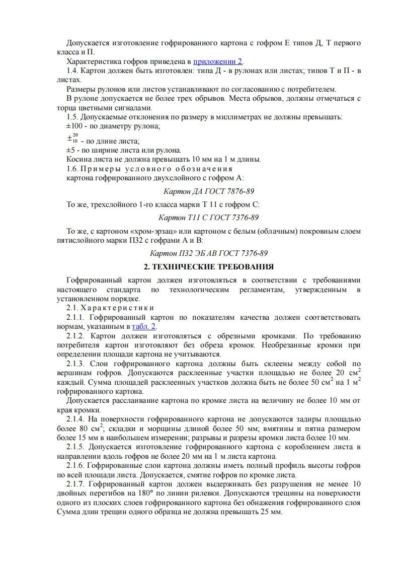 TOCYIAPCTBEHHLIN CTAHIAPT COIO3A CCPKAPTOH TOPHPOBAHHbIMOBIIINE TEXHNYECKHE YCIOBHAT0CT7376-89TOCYIAPCTBEHHLIN KOMNTET CCCP IIO CTAHIAPTAMMocKBaTOCYIAPCTBEHHLIN CTAHIAPT COIO3A CCPKAPTOH TOΦPHPOBAHHbINOomHe TexHHqecKHe ycoBHaTOCTCorrugated board.7376-89General specificationsCpok aeiicTBHac01.01.914001.01.96HecoomoeHne craHapra npecneayerca no 3akoHyHacrosui craHnapr pacnpocrpaHseTca Ha roopupoBaHHbi kapToH,npenha3HayeHHblI H3rOTOBIeHH HKOB H BCnOMOraTeJbHbIX ynaKoBOYHbIX cpeCTB.CraHnapT He pacnpoctpahaerca Ha cneunanbHo 06paooraHHbii roopupoBaHHbi kapToH.1.OCHOBHbIE IAPAMETPbI H PA3MEPbI1.1.B 3aBHCHMOCTH OT 4HcJa cnoeB roopupoBaHHbl kapToH noKeH 6bITb H3rOTOBJeHcJeyOIHX THNOB:I-IByxcJoMHbIM,COCTOIHM H3 OJHOrO nJIOCKOrO H ONHoro roopHpoBaHHoro cJioeB;T-TpexCJoMHbIM,COCTOSIIH H3 IByX IIOCKHX H OAHOrO roopHpoBaHHorO CJIOs;II-nATHCJIOMHbIM,COCTOIn H3 Tpex nJocKHx (AByx Hapy KHbIX H OAHOrO BHyTpeHHero)H Byx roopHpoBaHHbIx cJoeB.1.2.ToopupoBaHHbli kapToH H3roToBerca knaccoB H Mapok,yka3aHHbIX B Taon.1.Ta6nmua 1TunKnaceMapka瓜TT11,T12,T13.T14.T152T21,T22,T23,T24,T25,T26,T27Π3Π31,Π32,Π33,Π34,Π35,Π36,Π37Ha3HayeHHe Mapok roopupoBaHHoro kapToHa naHo B npwoxkeHun 11.3.ToopupoBaHHbli kapToH nomKeH 6bITb H3roroBneH c roopaMn A,C,B.