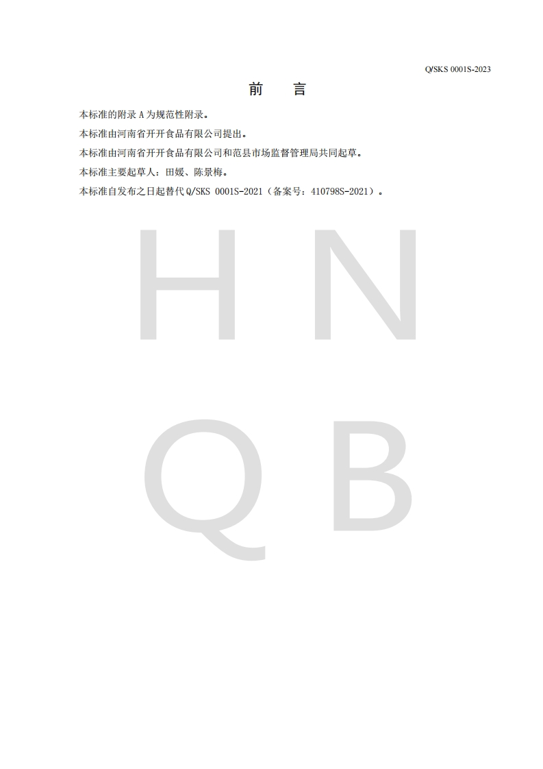 河南省开开食品有限公司企业强制性标准规范蒸煮淀粉肉肠Q_SKS0001S-2023348072@abc2个月前发布关注私信2.37MB16页027河南省开开食品有限公司企业强制性标准规范蒸煮淀粉肉肠Q_SKS0001S-2023此内容为付费资源,请付费后查看¥19¥23黄金会员免费钻石会员免费立即购买您当前未登录!建议登陆后购买,可保存购买订单付费资源 第1页 / 共16页 第2页 / 共16页 试读已结束,还剩14页,您可下载完整版后进行离线阅读 THE END标准规范 文本预览 411814S-2023河南省开开食品有限公司企业标准Q/SKS0001S-2023蒸煮淀粉肉肠2023-06-23发布2023-06-23实施河南省开开食品有限公司发布 查看更多 收起部分 喜欢就支持一下吧收藏