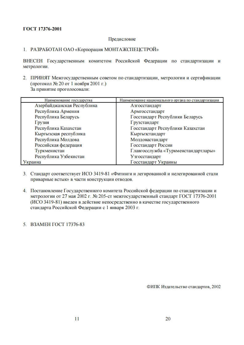 T0CT17376-2001MC03419-81)MEK IOC Y IA P C T BE HH bIH C TA HIA PTeramn TpyoonpoBoJoB oecIoBHbIe npnBapHble H3yrjeponcton H Hn3KoJernpoBaHHon crannTPOHHIKIKOHCTPyKIIHSTM3 ame o中LHaIbHoeMEKTOCYAPCTBEHHbIA COBET IIO CTAHIAPTH3ALIHH,METPOIOTHH H CEPTHHKALIHHM HH C K