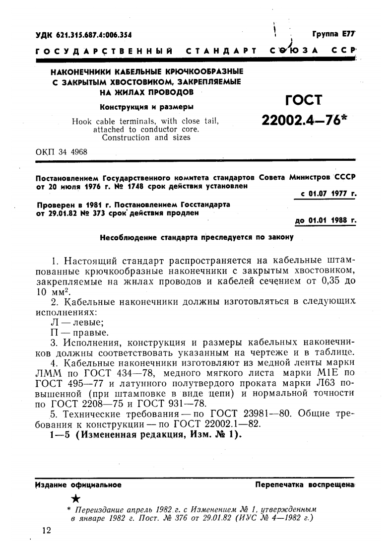 yAK621.315.687.4:006.354Tpynna E77T O C y AA P C T B E HH bIM C T A HA A P T3 A CC PHAKOHEYHHKM KABENbHbIE KPOYKOOSPA3HbIEC 3AKPbITbIM XBOCTOBHKOM,3AKPENNAEMbIEHA XKHJAX nPOBOAOBTOCTKoHcTpykuma K pa3mepblHook cable terminals,with close tail,22002.4-76*attached to conductor core.Construction and sizes0KΠ344968nocTaHoBneHHeM rocyAapcTBeHHoro KOMHTeTa cTaHAapToB CoBeTa MHHKCTPOB CCCPOT 20 Hiona 1976 r.No 1748 cpok AeMcTBMa ycTaHoBneHc01.071977r.npoBepeH B 1981 r.nocTaHoBneHMeM roccTaHAapTaOT 29.01.82 Ne 373 cpok AencTBma npoaneHA001.011988r.Heco6nAeHMe cTaHAapTa npecneAyerca no 3akoHy1.Hacrosun cTaHnapT pacnpocTpaHserca Ha kabenbHble wTaM-nOBaHHbIe KployKooopa3Hble HaKoHeyHHKH c 3aKpbITbIM XBOCTOBHKOM,3akpennaeMbie Ha KHJax npoBonoB H Kabenen ceyeHneM OT 0,35 no10 MM2.2.Ka6eJbHble HaKoHeyHHKH IOJKHBI H3rOTOBJIATbC B cJeyloHxHCnOJHeHHaX:JI-JeBbIe;Π-npaBbre,3.HcnoJHeHHs,KOHCTpyKIna H pa3MepbI KaoeJbHbIx HaKoHeyHH-KOB IOJKHbI COOTBeTCTBOBaTb yka3aHHbIM Ha yepTexke H B Ta6JHIe.4.Ka6enbHble HaKoHeyHHKH H3rOTOBJIAOT H3 MeHon JeHTbI MapKHJIMM no TOCT 434-78,MeHoro Markoro HcTa MapKn MIE noTOCT 495-77 H JaTyHHoro nonyTBepnoro npokaTa MapKn J163 no-BbIIeHHOH (npH ITaMnoBke B BHne Ienn)H HopMaJbHOn TOYHOCTHI0Γ0CT.2208-75HT0CT931-78.5.TexHHyeckHe Tpe6oBaHHa-no TOCT 23981-80.O6utHe Tpe-6 OBaHHa K KOHCTPyKuHH一I0TOCT22002.1一82.1-5 (M3MeHeHHas penakuna,M3M.Ne 1).M3 gaHke o中M4 ManbHoenepeneuaTka BocnpeweHa★nepeu3daHue anpenb 1982.2.c H3MeHenueM N 1.yreepxcdeHHblM6RH6ape19822.7ocT.№376oT29.01.82(HVC94-1982e.)12