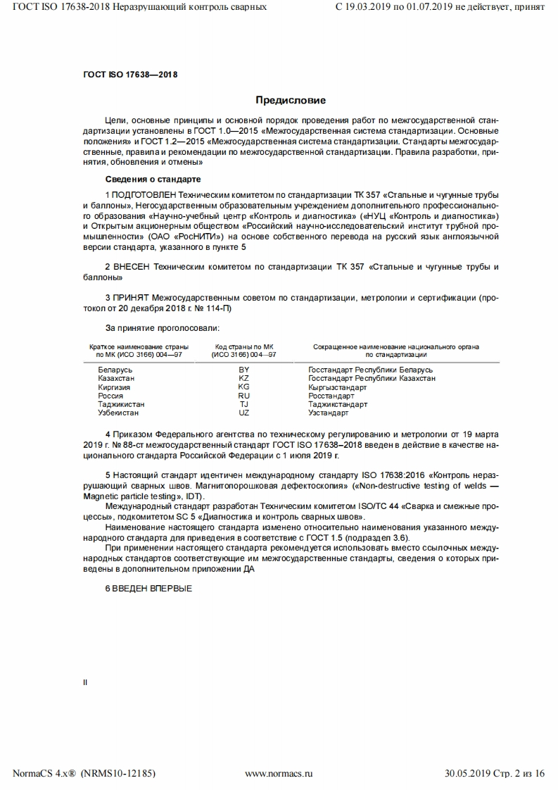 MEXKrOCynAPCTBEHHbIN COBET nO CTAHDAPTN3ALNN,METPOnOMM M CEPTNNKALMN(MrC)INTERSTATE COUNCIL FOR STANDARDIZATION,METROLOGY AND CERTIFICATION(ISC)rocTMEXrOCyAAPCTBEHHbIMCTAHAAPT1S0176382018Hepa3pywarownn KOHTponb cBapHbix coeAnHeHnNMArHNTONOPOLKOBbIN KOHTPONb1S017638:2016,Non-destructive testing of welds-Magnetic particle testing,IDT)3naHme o中uManbHoeMocKRaCTaHnapTMH中OpM2019NormaCS 4.xR (NRMS10-12185)www.normacs.ru30.05.2019CTp.1B16