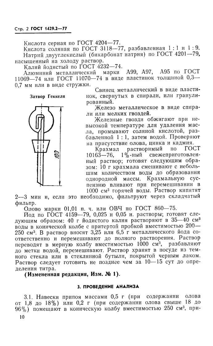 yK621.791.35:669.654:546.811.06:006.354Tpynna B59r O C y A APC T BEHHbIN CT AH D A P T C O K3 ACC P.四TOCTnPhnon OnoBAHHO-CBMHLCEbIEMeTog oipegeneHna cogepikaHnx onoBa1429.2-77*Tin-lead solders.Method for the determination of tin conlentB3ameHr0CT1429.2-69noctaHoaneHHeM TocyAapcTBeHHoro KOMHTeTa cTaHAapTOB CoBeTa MHHHCTPOB CCCPoT 1f anpena 1977 r.Ne 886 cpok AeMcTBna ycTaHoBneHc01.01.78nposepeH B 1982 r.nocraHoBneHMeM ToccraHgapTa oT 21.01.83 Ng 327pok geMcTBna npoaneHA001.01.88Heco6noAeHHe cTaHAapTa npecneAyerca no 3akoHyHacToauni cTaHnapr ycraHaBnHBaeT oobeMHbIn iozoMeTpiyeckniMero onpeneJeHn:分comepkaH牙OJOBa B OJIOB牙HHO-CBHHHOBLIX NPH-nc5x (npH conepxkaHHH ooBa oT 1,8 0 96%).MeTon oCHoBaH Ha peaKuHH oKHcneHna MOAOMByXBaJeHTHOrOonoBa no yeTbIpexBaJeHTHorO B cepHoco.IHOKHCJIOM pacTBope.B Ka-yecTBe BoccTaHoBHTeJ npHmeHalOT MeTaJnyeckH aJoMHHH HJHCBilHelt.BoJbiHe KoJHyecTBa cypbMbl H Men BblleJIOT Ha Meta-H4ecKoM Kene3e.HaBecky npunoa pa3naraIoT B cepHon KHcIoTe.1.O6斟ME TPE5 OBAHMS91.1.O6ieTpe6oBaHHs K Merony aHann3a no TOCT1429.0-77.2.AnnAPATYPA,PEAKTMBbI M PACTBOPbI3aTBop Tekkes,BopoHKa c 6HKap6oHaTHbIM 3aTBOPOM (CM.yep-TO)CJyKHT s npenoxpaHeHH ByxBaneHTHorO OJOBa OT OKHcne-HHs KHCJOPOAOM Bo3yxa.3aTBop BcTaBJISIOT B ropJ10 KOJ6bI npitnOMOLIH pe31HOBO npOOKH H 3anOHOT HacuuLeHHbIM paCTBOpOMOHKaDCOHaTa HaTpHa.HameTp OTBepeTHa BbIXOIHO TPYOKH BOPOHKH HOJKCH 6bITb HeMeHee 2,5-3,0 MM.Msparme o中H4 nanbHoeNepeneuarka BocnpeweHa★*nepeusoamue mapr 1983 2.c H3memenues 1.ureepacoeRnu6aH8ape19832.;7ocT.83240r21.01.83(HVC5-19832.45r-5C多3浅%甲生式59,7之分2子T及h4A,-美C了