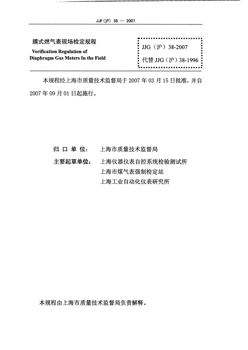 JJG(沪)38-2007膜式燃气表现场检定规程348072@abc4个月前发布关注私信0.30MB10页024JJG(沪)38-2007膜式燃气表现场检定规程此内容为付费资源,请付费后查看¥17¥23黄金会员免费钻石会员免费立即购买您当前未登录!建议登陆后购买,可保存购买订单付费资源 第1页 / 共10页 第2页 / 共10页 试读已结束,还剩8页,您可下载完整版后进行离线阅读 THE END标准规范 文本预览 可可(沪)上海市地方计量检定规程JJG(沪)38-2007膜式燃气表现场检定规程Verification Regulation of Diaphragm Gas Meters In the Field2007-03-15发布2007-09-01实施上海市质量技术监督局发布 查看更多 收起部分 喜欢就支持一下吧收藏