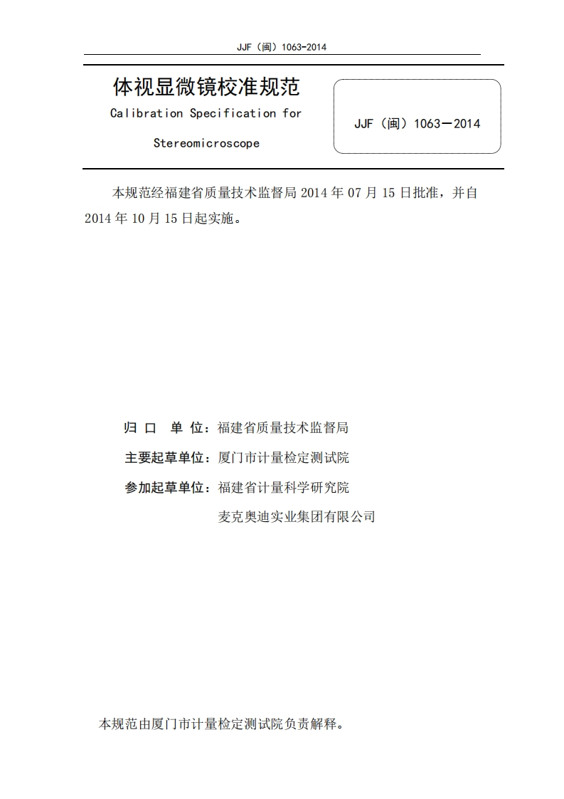 JJG(闽)1063-2014体视显微镜校准规范348072@abc4个月前发布关注私信0.33MB21页030JJG(闽)1063-2014体视显微镜校准规范此内容为付费资源,请付费后查看¥17¥23黄金会员免费钻石会员免费立即购买您当前未登录!建议登陆后购买,可保存购买订单付费资源 第1页 / 共21页 第2页 / 共21页 试读已结束,还剩19页,您可下载完整版后进行离线阅读 THE END标准规范 文本预览 可F福建省地方计量技术规范JUJF(闽)1063-2014体视显微镜校准规范Cal ibration Specification for Stereomicroscope2014-07-15发布2014-10-15实施福建省质量技术监督局发布 查看更多 收起部分 喜欢就支持一下吧收藏