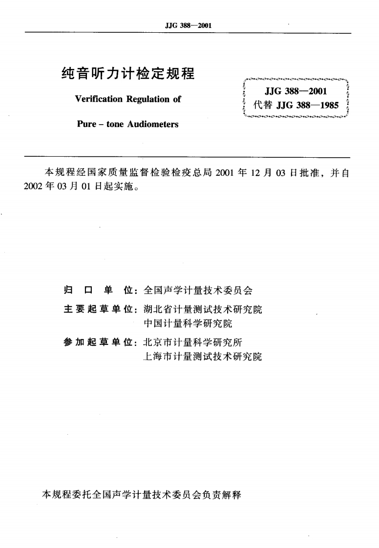 JJG388-2001纯音听力计348072@abc4个月前发布关注私信1.08MB47页029JJG388-2001纯音听力计此内容为付费资源,请付费后查看¥13¥18黄金会员免费钻石会员免费立即购买您当前未登录!建议登陆后购买,可保存购买订单付费资源 第1页 / 共47页 第2页 / 共47页 试读已结束,还剩45页,您可下载完整版后进行离线阅读 THE END标准规范 文本预览 可G中华人民共和国国家计量检定规程JJG388-2001纯音听力计Pure-tone Audiometers2001-12-03发布2002-03-01实施国家质量监督检验检疫总局发布 查看更多 收起部分 喜欢就支持一下吧收藏