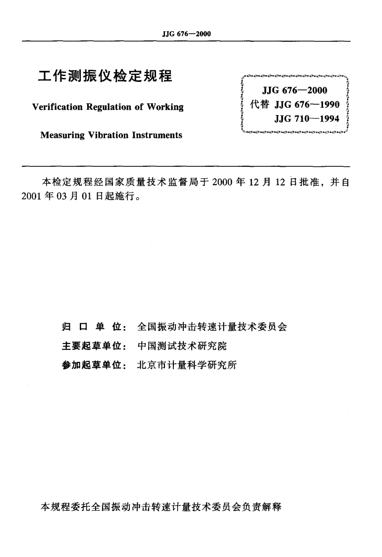 jjg676-2000348072@abc4个月前发布关注私信0.23MB12页022jjg676-2000此内容为付费资源,请付费后查看¥13¥18黄金会员免费钻石会员免费立即购买您当前未登录!建议登陆后购买,可保存购买订单付费资源 第1页 / 共12页 第2页 / 共12页 试读已结束,还剩10页,您可下载完整版后进行离线阅读 THE END标准规范 文本预览 JJG中华人民共和国国家计量检定规程JJG676一2000工作测振仪Working Measuring Vibration Instruments2000-12-12发布2001-03-01实施国家质量技术监督局发布 查看更多 收起部分 喜欢就支持一下吧收藏