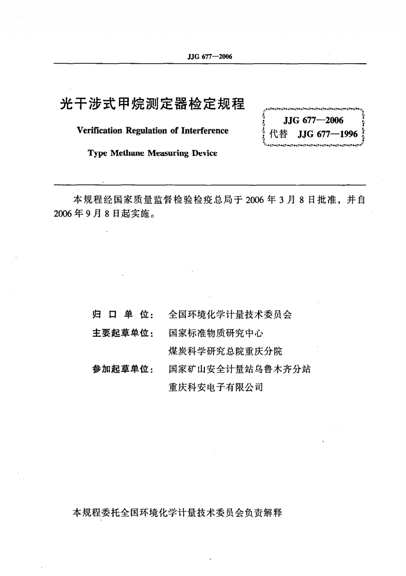 JJG677-2006光干涉型甲烷测定器348072@abc4个月前发布关注私信0.40MB15页034JJG677-2006光干涉型甲烷测定器此内容为付费资源,请付费后查看¥13¥18黄金会员免费钻石会员免费立即购买您当前未登录!建议登陆后购买,可保存购买订单付费资源 第1页 / 共15页 第2页 / 共15页 试读已结束,还剩13页,您可下载完整版后进行离线阅读 THE END标准规范 文本预览 可G中华人民共和国国家计量检定规程JJG677-2006光干涉式甲烷测定器Interference Type Methane Measuring Device2006-03-08发布2006-09-08实施国家质量监督检验检疫总局发布 查看更多 收起部分 喜欢就支持一下吧收藏