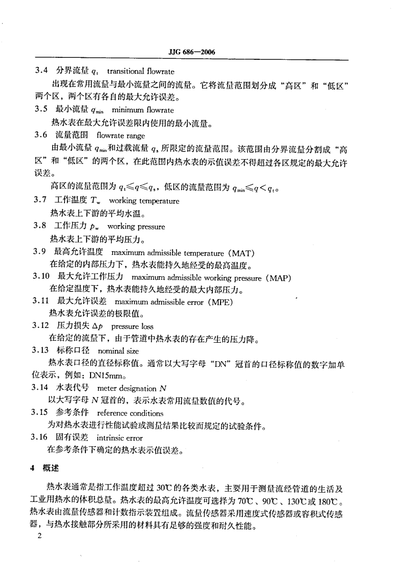 JJG686-2006热水表检定规程本规程根据我国现状,参照采用国际法制计量组织(OIML)的国际建议R72《热水表》(1984年)和R49一1《用于测量可饮用冷水和热水的水表第1部分计量与技术要求》(2004年草案)、R49一2《用于测量可饮用冷水和热水的水表第2部分试验方法》(2004年草案)。1范围本规程适用于热水表的型式评价、首次检定、后续检定和使用中检验。2引用文献下列文献所包含的条文,通过引用而构成为本规程的条文。OIML R72:1984《Hot Water Meters》(热水表)OIML R49-1 (Draft):2004 Water meters intended for the metering of cold potablewater and hot water一Part 1:Metrological and technical requirements》[用于测量可饮用冷水和热水的水表第1部分计显与技术要求(草案)]OIML R49-2 (Draft):2004 Water meters intended for the metering of cold potablewater and hot water-一Part2:Test Methods》[用于测量可饮用冷水和热水的水表第2部分试验方法(草案)]ISO 10385-1:2000 (Measurement of water flow in closed conduits-Meters forhot water一Part 1:Specifications》(封闭管道中的水流量测量热水水表第1部分:规范)JB/T8802一1998热水水表规范JJG225一2001热能表检定规程GB/T778.3一1996冷水水表第3部分试验方法和试验设备JJF1015一2002计量器具型式评价和型式评价通用规范JJF1016一2002计量器具型式评价大纲编写导则使用本规程时,应注意使用上述引用文献的现行有效版本。3术语3.1热水表hot water meter用于测量和显示流经管路的热水体积总量的水表。3.2常用流量p permanent flowrate热水表在额定工作条件下符合计量性能要求的最佳使用的最大流量。3.3过载流量g,overload flowrate热水表在示值不超过最大允许误差的情况下,能够短期运行的最大流量。过载流量值为常用流量9。的两倍。