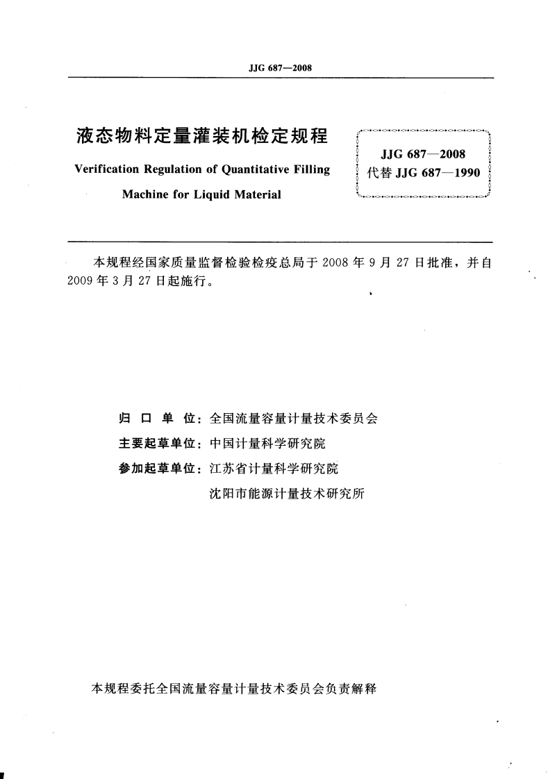 JJG687-2008液态物料定量灌装机348072@abc4个月前发布关注私信1.54MB15页027JJG687-2008液态物料定量灌装机此内容为付费资源,请付费后查看¥13¥18黄金会员免费钻石会员免费立即购买您当前未登录!建议登陆后购买,可保存购买订单付费资源 第1页 / 共15页 第2页 / 共15页 试读已结束,还剩13页,您可下载完整版后进行离线阅读 THE END标准规范 文本预览 U可g中华人民共和国国家计量检定规程JJG687一2008液态物料定量灌装机Quantitative Filling Machine for Liquid Material2008-09-27发布2009-03-27实施国家质量监督检验检疫总局发布 查看更多 收起部分 喜欢就支持一下吧收藏