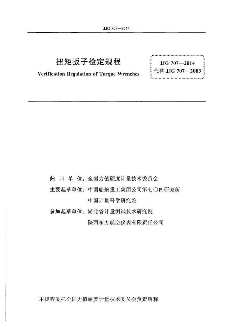 JJG707-2014扭矩扳子348072@abc4个月前发布关注私信0.52MB17页033JJG707-2014扭矩扳子此内容为付费资源,请付费后查看¥13¥18黄金会员免费钻石会员免费立即购买您当前未登录!建议登陆后购买,可保存购买订单付费资源 第1页 / 共17页 第2页 / 共17页 试读已结束,还剩15页,您可下载完整版后进行离线阅读 THE END标准规范 文本预览 可G中华人民共和国国家计量检定规程JJG707-2014扭矩扳子Torque Wrenches2014-06-15发布2014-12-15实施国家质量监督检验检疫总局发布 查看更多 收起部分 喜欢就支持一下吧收藏