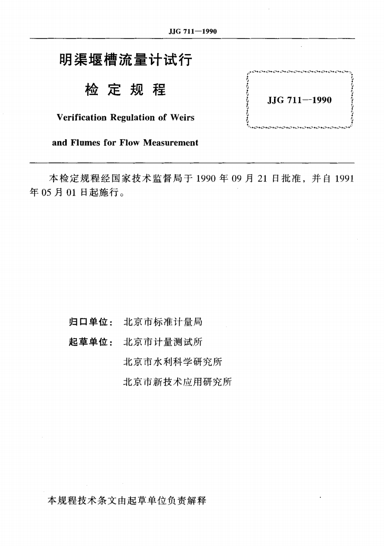 JJG711-1990明渠堰槽流量计(试行)348072@abc4个月前发布关注私信1.47MB57页043JJG711-1990明渠堰槽流量计(试行)此内容为付费资源,请付费后查看¥13¥18黄金会员免费钻石会员免费立即购买您当前未登录!建议登陆后购买,可保存购买订单付费资源 第1页 / 共57页 第2页 / 共57页 试读已结束,还剩55页,您可下载完整版后进行离线阅读 THE END标准规范 文本预览 可可G中华人民共和国国家计量检定规程JJG711-1990明渠堰槽流量计(试行)Weirs and Flumes for FlowMeasurement1990-09-21发布1991-05-01实施国家技术监督局发布 查看更多 收起部分 喜欢就支持一下吧收藏