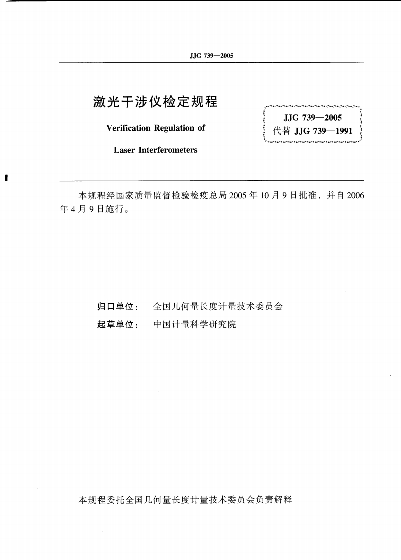 JJG739-2005激光干涉仪检定规程348072@abc4个月前发布关注私信0.35MB13页040JJG739-2005激光干涉仪检定规程此内容为付费资源,请付费后查看¥13¥18黄金会员免费钻石会员免费立即购买您当前未登录!建议登陆后购买,可保存购买订单付费资源 第1页 / 共13页 第2页 / 共13页 试读已结束,还剩11页,您可下载完整版后进行离线阅读 THE END标准规范 文本预览 可可G中华人民共和国国家计量检定规程JJG739-2005激光干涉仪Laser Interferometers2005-10-09发布2006-04-09实施国家质量监督检验检疫总局发布 查看更多 收起部分 喜欢就支持一下吧收藏