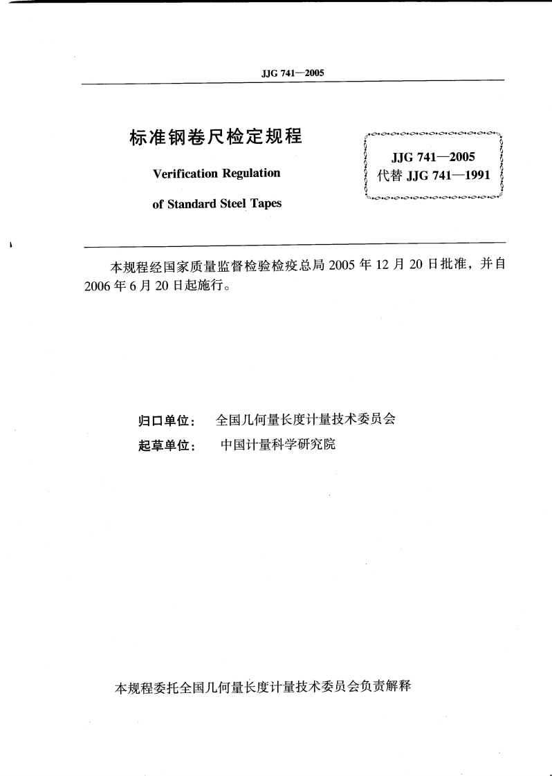JJG741-2005标准钢卷尺检定规程348072@abc4个月前发布关注私信0.42MB13页022JJG741-2005标准钢卷尺检定规程此内容为付费资源,请付费后查看¥13¥18黄金会员免费钻石会员免费立即购买您当前未登录!建议登陆后购买,可保存购买订单付费资源 第1页 / 共13页 第2页 / 共13页 试读已结束,还剩11页,您可下载完整版后进行离线阅读 THE END标准规范 文本预览 可可G中华人民共和国国家计量检定规程JJG741一2005标准钢卷尺Standard Steel Tapes2005-12-20发布2006-6-20实施国家质量监督检验检疫总局发布 查看更多 收起部分 喜欢就支持一下吧收藏