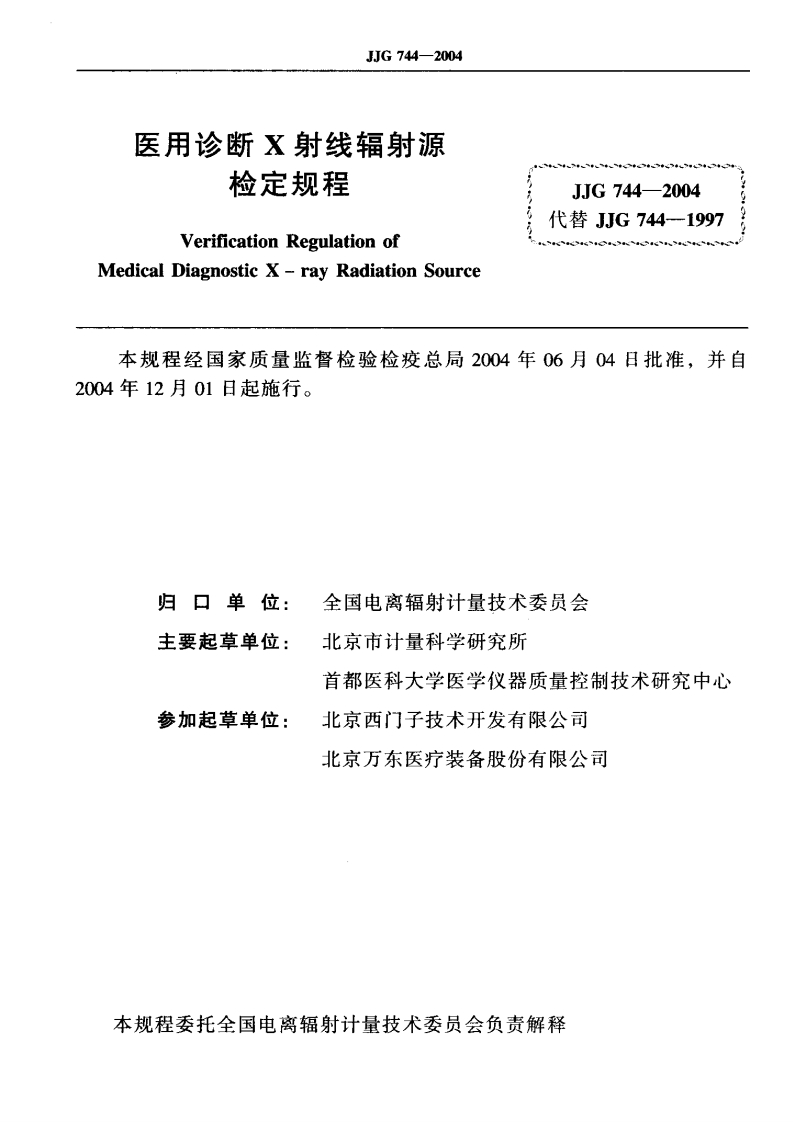 JJG744-2004医用诊断X射线辐射源348072@abc4个月前发布关注私信0.82MB31页034JJG744-2004医用诊断X射线辐射源此内容为付费资源,请付费后查看¥13¥18黄金会员免费钻石会员免费立即购买您当前未登录!建议登陆后购买,可保存购买订单付费资源 第1页 / 共31页 第2页 / 共31页 试读已结束,还剩29页,您可下载完整版后进行离线阅读 THE END标准规范 文本预览 可可G中华人民共和国国家计量检定规程JJG744一2004医用诊断X射线辐射源Medical Diagnostic X-ray Radiation Source2004-06-04发布2004-12-01实施国家质量监督检验检疫总局发布 查看更多 收起部分 喜欢就支持一下吧收藏