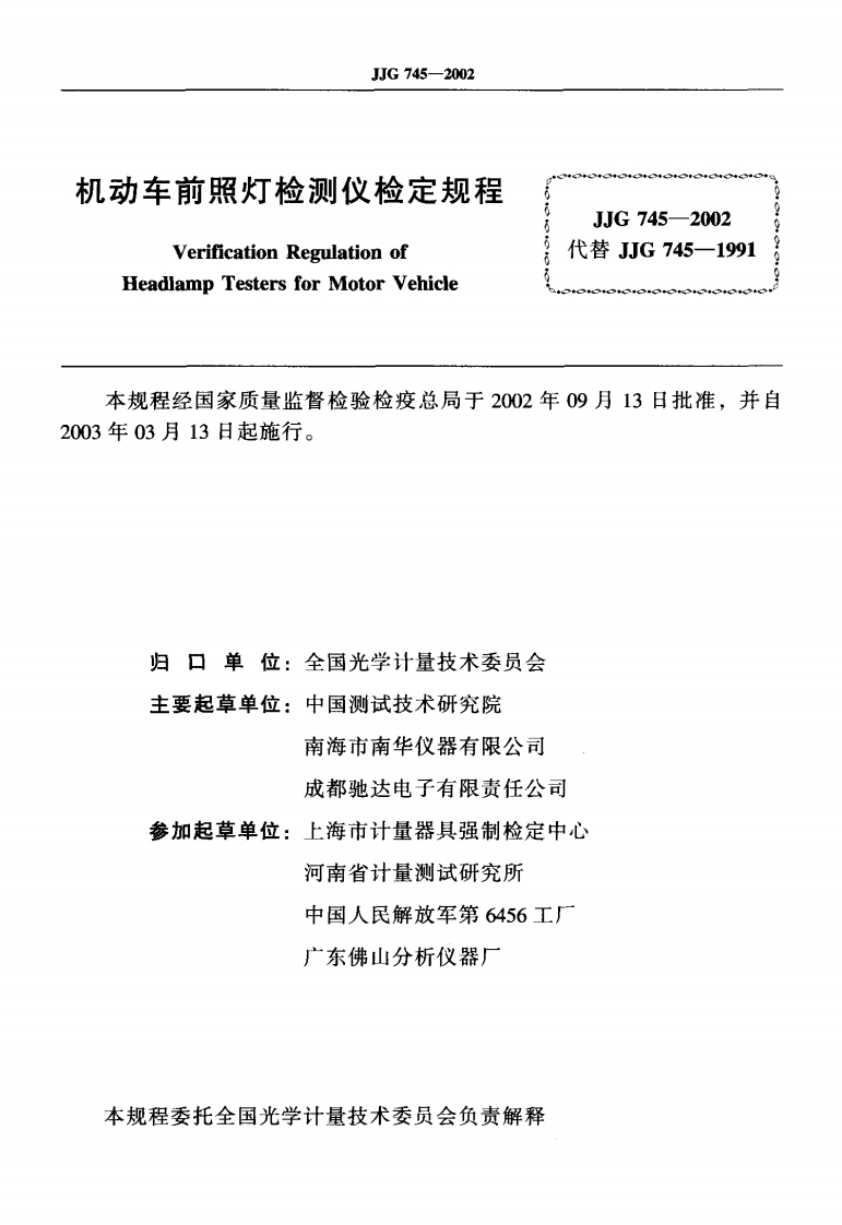 JJG745-2002机动车前照灯检测仪348072@abc4个月前发布关注私信0.39MB13页037JJG745-2002机动车前照灯检测仪此内容为付费资源,请付费后查看¥13¥18黄金会员免费钻石会员免费立即购买您当前未登录!建议登陆后购买,可保存购买订单付费资源 第1页 / 共13页 第2页 / 共13页 试读已结束,还剩11页,您可下载完整版后进行离线阅读 THE END标准规范 文本预览 可可G中华人民共和国国家计量检定规程JJG745-2002机动车前照灯检测仪Headlamp Testers for Motor Vehicle2002-09-13发布2003-03-13实施国家质量监督检验检疫总局发布 查看更多 收起部分 喜欢就支持一下吧收藏