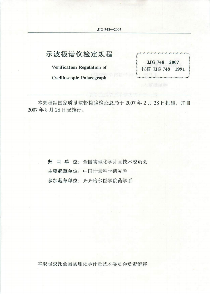 JJG748-2007示波极谱仪348072@abc4个月前发布关注私信2.45MB15页024JJG748-2007示波极谱仪此内容为付费资源,请付费后查看¥13¥18黄金会员免费钻石会员免费立即购买您当前未登录!建议登陆后购买,可保存购买订单付费资源 第1页 / 共15页 第2页 / 共15页 试读已结束,还剩13页,您可下载完整版后进行离线阅读 THE END标准规范 文本预览 J可G中华人民共和国国家计量检定规程JJG748-2007示波极谱仪Oscilloscopic Polarograph2007-02-28发布2007-08-28实施国家质量监督检验检疫总局发布 查看更多 收起部分 喜欢就支持一下吧收藏