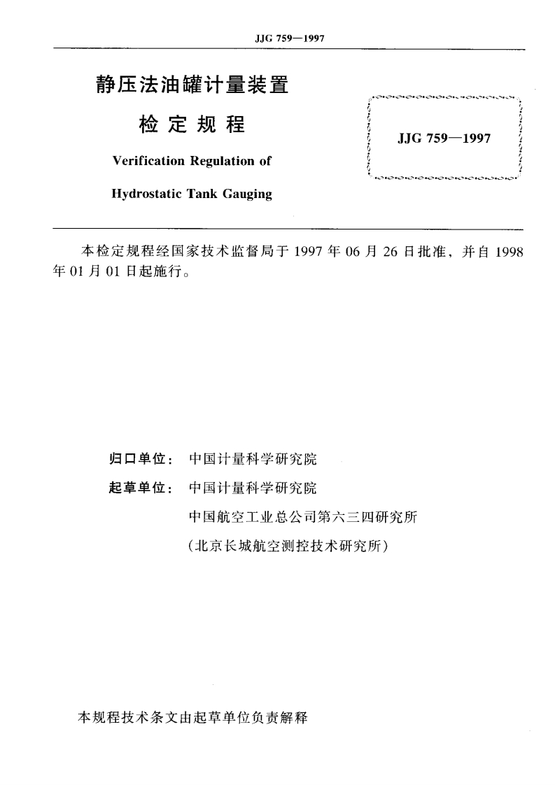 JJG759-1997静压法油罐计量装置348072@abc4个月前发布关注私信0.40MB20页032JJG759-1997静压法油罐计量装置此内容为付费资源,请付费后查看¥13¥18黄金会员免费钻石会员免费立即购买您当前未登录!建议登陆后购买,可保存购买订单付费资源 第1页 / 共20页 第2页 / 共20页 试读已结束,还剩18页,您可下载完整版后进行离线阅读 THE END标准规范 文本预览 JJG中华人民共和国国家计量检定规程JJG759一1997静压法油罐计量装置Hydrostatic Tank Gauging1997-06-26发布1998-01-01实施国家技术监督局发布 查看更多 收起部分 喜欢就支持一下吧收藏