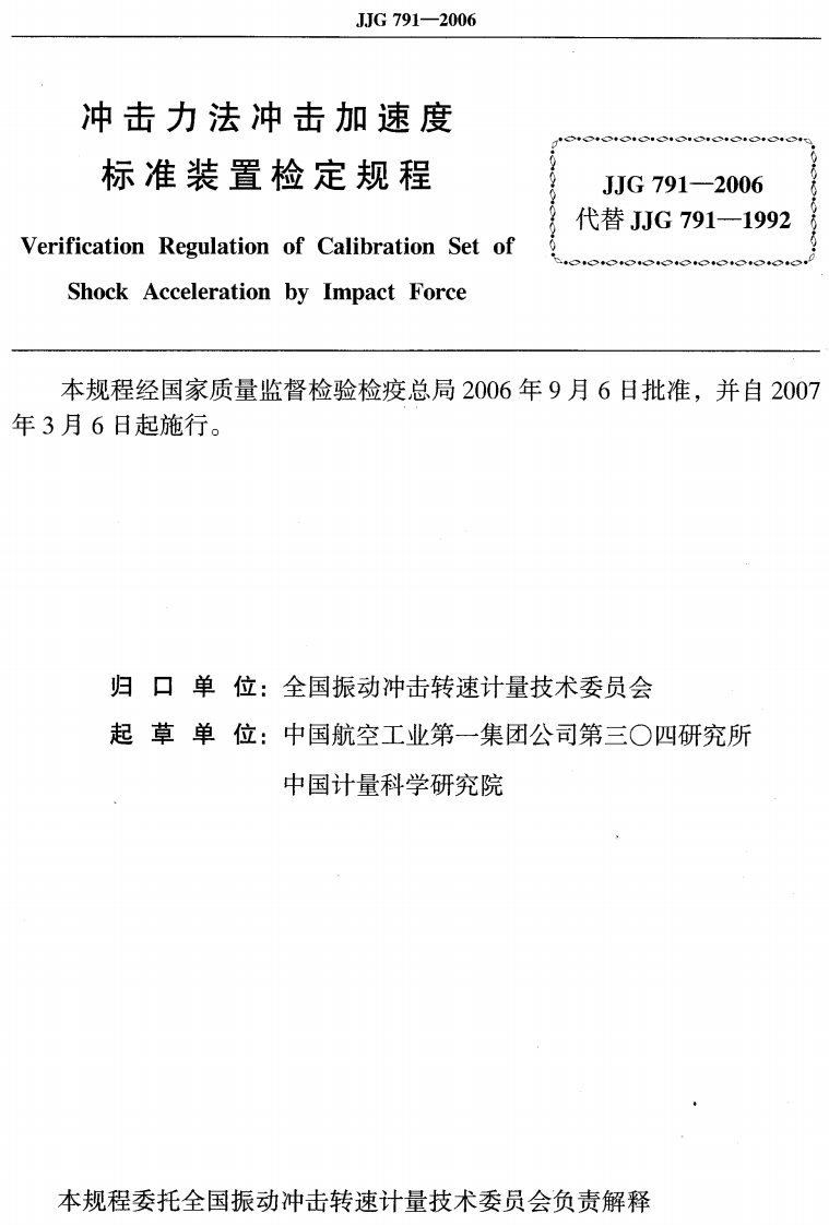 JJG791-2006冲击力法冲击加速度标准装置348072@abc3个月前发布关注私信0.48MB20页024JJG791-2006冲击力法冲击加速度标准装置此内容为付费资源,请付费后查看¥13¥18黄金会员免费钻石会员免费立即购买您当前未登录!建议登陆后购买,可保存购买订单付费资源 第1页 / 共20页 第2页 / 共20页 试读已结束,还剩18页,您可下载完整版后进行离线阅读 THE END标准规范 文本预览 力-A-山可G中华人民共和国国家计量检定规程JJG791一2006冲击力法冲击加速度标准装置Calibration Set of Shock Acceleration by Impact Force2006-09-06发布2007-03-06实施国家质量监督检验检疫总局发布 查看更多 收起部分 喜欢就支持一下吧收藏