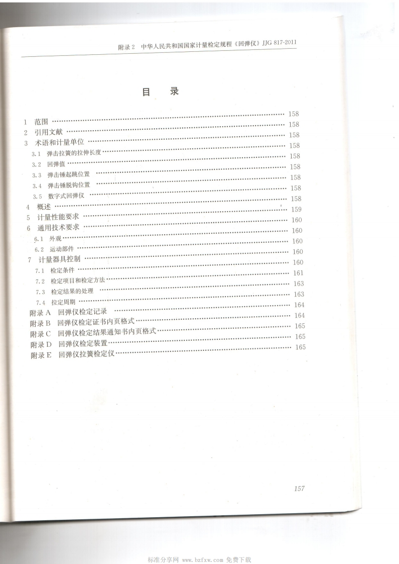 附录2中华人民共和国国家计量检定规程《回弹仪》JJG817-2011中华人民共和国行业标准回弹仪Rebound Test HammerJJG817-2011代替JJG817-1993归口单位:全国力值硬度计量技术委员会主要起草单位:陕西省建筑科学研究院中国计量科学研究院参加起草单位:舟山市博远科技开发有限公司山东省乐陵市回弹仪厂本规程委托全国力值硬度计量技术委员会负责解释本规程主要起草人:文恒武(陕西省建筑科学研究院)张伟(中国计量科学研究院)参加起草人:诸华丰(舟山市博远科技开发有限公司)魏超琪(陕西省建筑科学研究院)王明堂(山东省乐陵市回弹仪厂)156