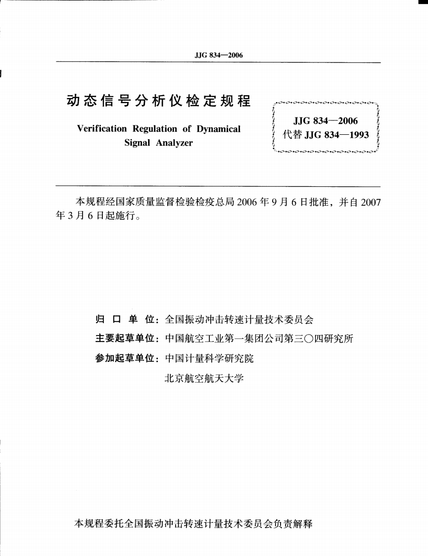 JJG834-2006动态信号分析仪348072@abc4个月前发布关注私信0.57MB16页030JJG834-2006动态信号分析仪此内容为付费资源,请付费后查看¥12¥22黄金会员免费钻石会员免费立即购买您当前未登录!建议登陆后购买,可保存购买订单付费资源 第1页 / 共16页 第2页 / 共16页 试读已结束,还剩14页,您可下载完整版后进行离线阅读 THE END标准规范 文本预览 可G中华人民共和国国家计量检定规程JJG834-2006动态信号分析仪Dynamical Signal Analyzer2006-09-06发布2007-03-06实施国家质量监督检验检疫总局发布 查看更多 收起部分 喜欢就支持一下吧收藏