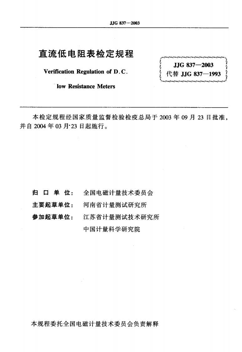 JJG837-2003直流低电阻表348072@abc4个月前发布关注私信0.35MB17页025JJG837-2003直流低电阻表此内容为付费资源,请付费后查看¥12¥22黄金会员免费钻石会员免费立即购买您当前未登录!建议登陆后购买,可保存购买订单付费资源 第1页 / 共17页 第2页 / 共17页 试读已结束,还剩15页,您可下载完整版后进行离线阅读 THE END标准规范 文本预览 可可G中华人民共和国国家计量检定规程JJG837一2003直流低电阻表D.C.low Resistance Meters2003-09-23发布2004-03-23实施国家质量监督检验检疫总局发布 查看更多 收起部分 喜欢就支持一下吧收藏