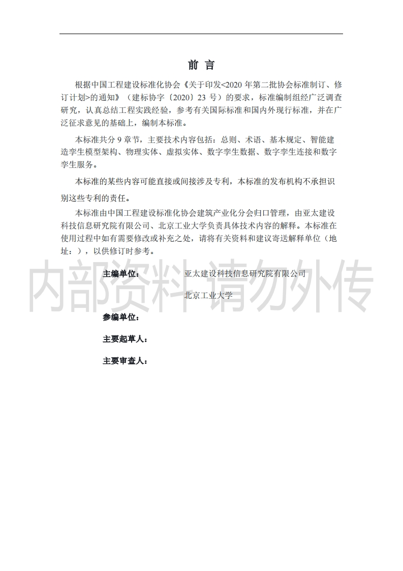 中国工程建设标准化协会标准《民用建筑工程智能建造孪生模型技术规程》Technicalstandardsforsmartconstructionofdigitaltwinmodelincivilengineering勿外传部资(T_CECS___-20__(征求意见稿)348072@abc29天前发布关注私信0.80MB32页020中国工程建设标准化协会标准《民用建筑工程智能建造孪生模型技术规程》Technicalstandardsforsmartconstructionofdigitaltwinmodelincivilengineering勿外传部资(T_CECS___-20__(征求意见稿)此内容为付费资源,请付费后查看¥14¥19黄金会员免费钻石会员免费立即购买您当前未登录!建议登陆后购买,可保存购买订单付费资源 第1页 / 共32页 第2页 / 共32页 试读已结束,还剩30页,您可下载完整版后进行离线阅读 THE END标准规范 喜欢就支持一下吧收藏