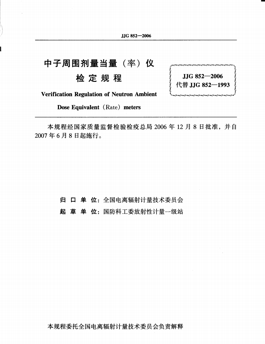 JJG852-2006中子周围剂量当量(率)仪348072@abc4个月前发布关注私信0.75MB20页029JJG852-2006中子周围剂量当量(率)仪此内容为付费资源,请付费后查看¥12¥22黄金会员免费钻石会员免费立即购买您当前未登录!建议登陆后购买,可保存购买订单付费资源 第1页 / 共20页 第2页 / 共20页 试读已结束,还剩18页,您可下载完整版后进行离线阅读 THE END标准规范 文本预览 可G中华人民共和国国家计量检定规程JJG852一2006中子周围剂量当量(率)仪Neutron Ambient Dose Equivalent (Rate)Meters2006-12-08发布2007-06-08实施国家质量监督检验检疫总局发布 查看更多 收起部分 喜欢就支持一下吧收藏