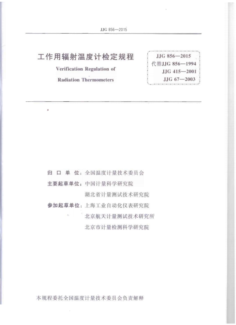 JJG856-2015工作用辐射温度计348072@abc2个月前发布关注私信3.47MB40页0437JJG856-2015工作用辐射温度计此内容为付费资源,请付费后查看¥12¥22黄金会员免费钻石会员免费立即购买您当前未登录!建议登陆后购买,可保存购买订单付费资源 第1页 / 共40页 第2页 / 共40页 试读已结束,还剩38页,您可下载完整版后进行离线阅读 © 版权声明文章版权归作者所有,未经允许请勿转载。THE END标准规范 文本预览 可可G中华人民共和国国家计量检定规程JJG856-2015工作用辐射温度计Radiation Thermometers2015-12-07发布2016-06-07实施国家质量监督检验检疫总局发布 查看更多 收起部分 喜欢就支持一下吧点赞7 分享QQ空间微博QQ好友海报分享复制链接收藏
