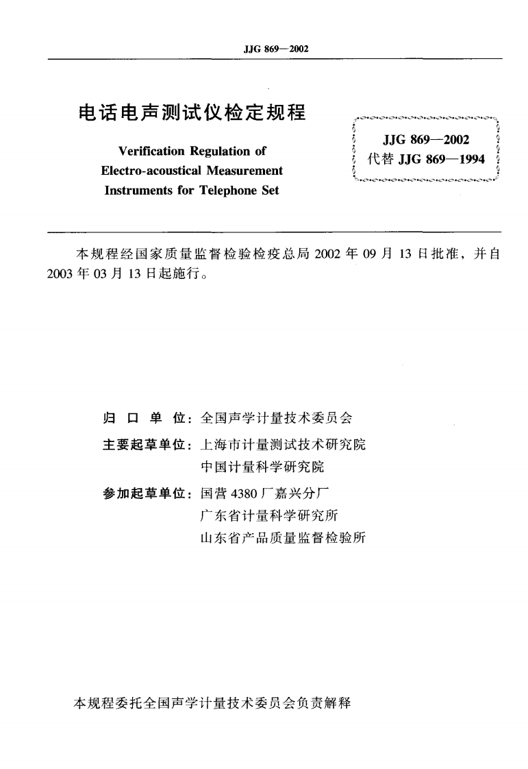 JJG869-2002电话电声测试仪348072@abc2个月前发布关注私信0.99MB33页04915JJG869-2002电话电声测试仪此内容为付费资源,请付费后查看¥12¥22黄金会员免费钻石会员免费立即购买您当前未登录!建议登陆后购买,可保存购买订单付费资源 第1页 / 共33页 第2页 / 共33页 试读已结束,还剩31页,您可下载完整版后进行离线阅读 © 版权声明文章版权归作者所有,未经允许请勿转载。THE END标准规范 文本预览 可可G中华人民共和国国家计量检定规程JJG869一2002.电话电声测试仪Electro-acoustical Measurement Instrumentsfor Telephone Set2002-09-13发布2003-03-13实施国家质量监督检验检疫总局发布 查看更多 收起部分 喜欢就支持一下吧点赞15 分享QQ空间微博QQ好友海报分享复制链接收藏