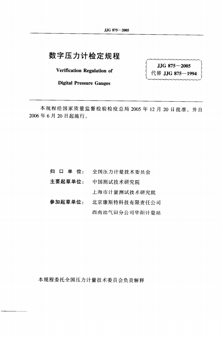 JJG875-2005数字压力计348072@abc4个月前发布关注私信0.32MB15页021JJG875-2005数字压力计此内容为付费资源,请付费后查看¥12¥22黄金会员免费钻石会员免费立即购买您当前未登录!建议登陆后购买,可保存购买订单付费资源 第1页 / 共15页 第2页 / 共15页 试读已结束,还剩13页,您可下载完整版后进行离线阅读 THE END标准规范 文本预览 订G中华人民共和国国家计量检定规程JJG875-2005数字压力计Digital Pressure Gauges2005-12-20发布2006-06-20实施国家质量监督检验检疫总局发布 查看更多 收起部分 喜欢就支持一下吧收藏