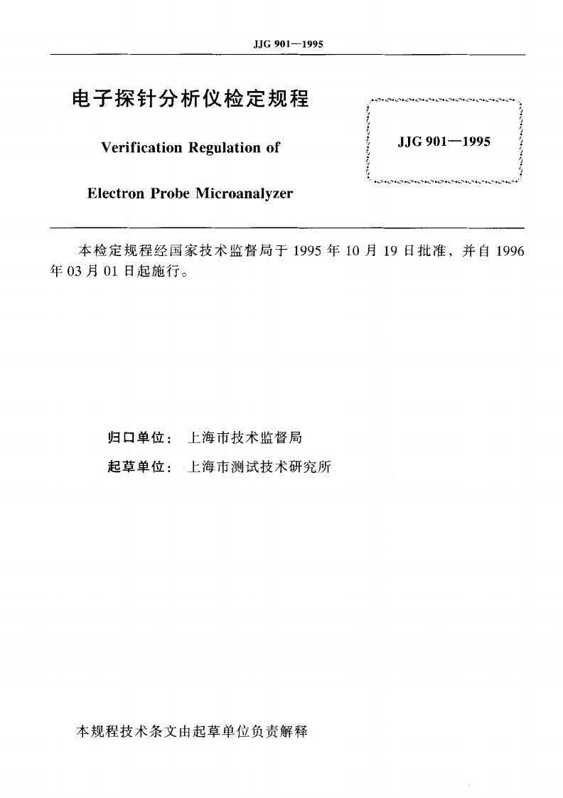 JJG901-1995电子探针分析仪348072@abc4个月前发布关注私信0.20MB12页036JJG901-1995电子探针分析仪此内容为付费资源,请付费后查看¥13¥23黄金会员免费钻石会员免费立即购买您当前未登录!建议登陆后购买,可保存购买订单付费资源 第1页 / 共12页 第2页 / 共12页 试读已结束,还剩10页,您可下载完整版后进行离线阅读 THE END标准规范 文本预览 可G中华人民共和国国家计量检定规程JJG901一1995电子探针分析仪Electron Probe Microanalyzer1995-10-19发布1996-03-01实施国家技术监督局发布 查看更多 收起部分 喜欢就支持一下吧收藏