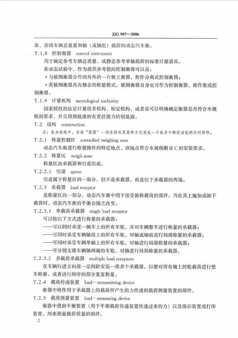 JJG907-2006术语(名词及定义)本规程中所用的术语与《国际计量基本词汇与通用术语》(VM-1993年版)、《法制计量词汇》(VIML一2000年版)相一致。此外,本规程还采用以下仅适用本规程的专用术语和定义:T.l一般定义general defnitonT.1.1质量massONIBSTand xo一种物理量,该物理量是以千克为基本单位的。T.1.2重量weight物体的重量是由于地心引力作用于物体的结果,因而重量是种与力具有相同性质的量。也可以称之为重力,其大小为该物体的质量与物体所在地重加速度的乘积。即:W兰g式中:W重量;m一质量;g一重力加速度。T.1.3载荷1oad因受重力作用,对衡器的承载器或地面施加力的被称物品、车辆、散料等实物,有时也直接指它们的作用力。T.l.4称量weighing对被称物体(车辆总质量或车辆局部)的质量所进行的测量,也叫称重。T.1.5衡器weighing instrument通过作用在物体上的重力来确定该物体质量的一种计量仪器。衡器也可以用于确定质量函数的其他数量、大小、参数或得性。按照其操作方式,可将衡器分为自动衡器和非自动衡器T.l.6自动衡器automatic weighing instrument在称量过程中不需要操作者干预,就能按照顶定的处理程序自动称量的衡器。T.l.7动态公路车辆自动衡器automa6 e instruments for weighing road vehicles in motion带有承载器并包括引道在内的,通过对行驶车辆的称量确定车辆的车辆总质量和(或)车辆轴载荷的一种自动衡器。动态公路车辆自动衡器简称动态汽车衡。动态汽车衡包括整车称量的动态汽车衡和轴称量的动态汽车衡(动态轴重衡)。T.l.7.1整车称量的动态汽车衡weighing instruments for a total vehicle in motion以整车称量方式确定行驶车辆总重量的动态汽车衡。T.l.7.2动态轴重衡weighing instruments for axles of vehicle in motion对行驶车辆的每一个轴(或轴组)分别称量,且能自动累加轴(或轴组)的称量结