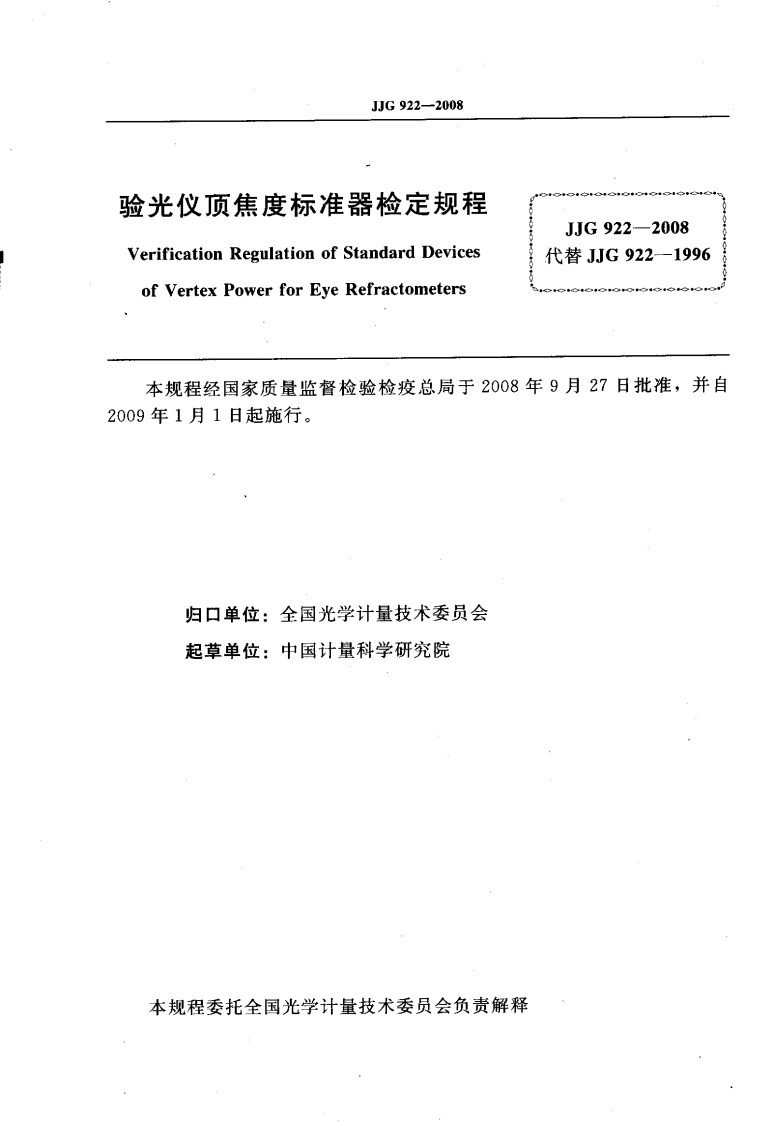 JJG922-2008验光仪顶焦度标准器348072@abc4个月前发布关注私信9.91MB16页040JJG922-2008验光仪顶焦度标准器此内容为付费资源,请付费后查看¥13¥23黄金会员免费钻石会员免费立即购买您当前未登录!建议登陆后购买,可保存购买订单付费资源 第1页 / 共16页 第2页 / 共16页 试读已结束,还剩14页,您可下载完整版后进行离线阅读 THE END标准规范 文本预览 可G中华人民共和国国家计量检定规程JJG922-2008:验光仪顶焦度标准器Standard Devices of Vertex Power for Eye Refractometers2008-09-27.发布2009-01-01实施国家质量监督检验检疫总局发布 查看更多 收起部分 喜欢就支持一下吧收藏