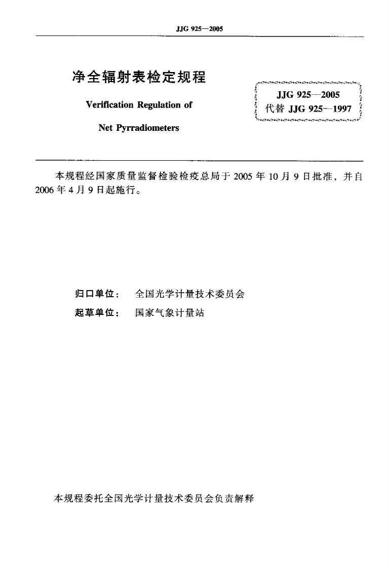 JJG925-2005净全辐射表348072@abc4个月前发布关注私信0.26MB14页038JJG925-2005净全辐射表此内容为付费资源,请付费后查看¥13¥23黄金会员免费钻石会员免费立即购买您当前未登录!建议登陆后购买,可保存购买订单付费资源 第1页 / 共14页 第2页 / 共14页 试读已结束,还剩12页,您可下载完整版后进行离线阅读 THE END标准规范 文本预览 中华人民共和国国家计量检定规程JJG925一2005净全辐射表Net Pyrradiometers2005-10-09发布2006-04-09实施国家质量监督检验检疫总局发布 查看更多 收起部分 喜欢就支持一下吧收藏