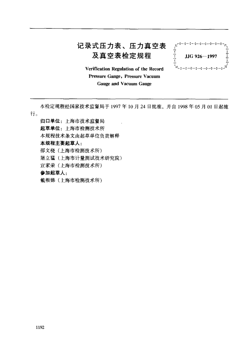 JJG926-1997记录式压力表、压力真空表及真空表348072@abc4个月前发布关注私信0.17MB8页049JJG926-1997记录式压力表、压力真空表及真空表此内容为付费资源,请付费后查看¥13¥23黄金会员免费钻石会员免费立即购买您当前未登录!建议登陆后购买,可保存购买订单付费资源 第1页 / 共8页 第2页 / 共8页 试读已结束,还剩6页,您可下载完整版后进行离线阅读 THE END标准规范 文本预览 记录式压力表、压力真空表及真空表检定规程JJG926一1997 查看更多 收起部分 喜欢就支持一下吧收藏