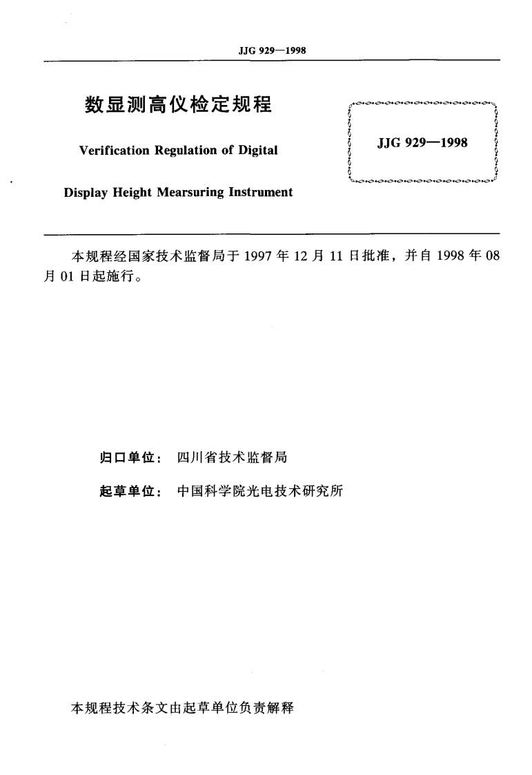 JJG929-1998数显测高仪348072@abc4个月前发布关注私信0.17MB10页041JJG929-1998数显测高仪此内容为付费资源,请付费后查看¥13¥23黄金会员免费钻石会员免费立即购买您当前未登录!建议登陆后购买,可保存购买订单付费资源 第1页 / 共10页 第2页 / 共10页 试读已结束,还剩8页,您可下载完整版后进行离线阅读 THE END标准规范 文本预览 可G中华人民共和国国家计量检定规程JJG929一1998数显测高仪Digital Display Height Mearsuring Instrument1997-12-11发布1998-08-01实施国家技术监督局发布 查看更多 收起部分 喜欢就支持一下吧收藏